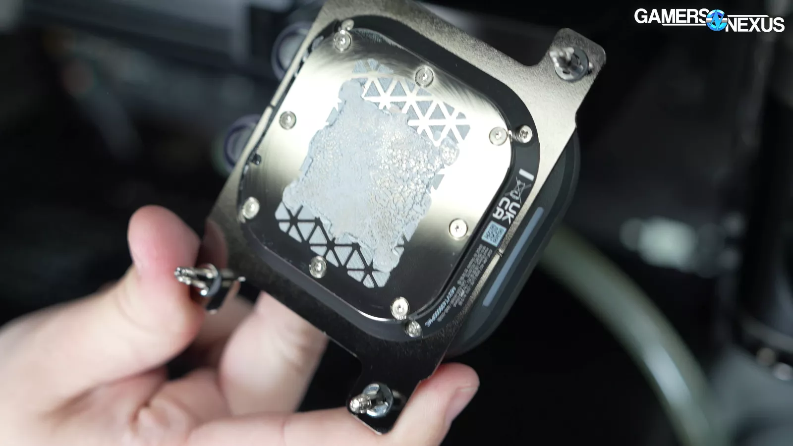 Removing the screws on the water block reveal that they are captive, which is nice. Looking at the pattern, we can see that they used pre-applied paste via a silk screen. That allowed contact for all 8 legs of the IHS, which looked good with overall even pressure. The block application was also good.