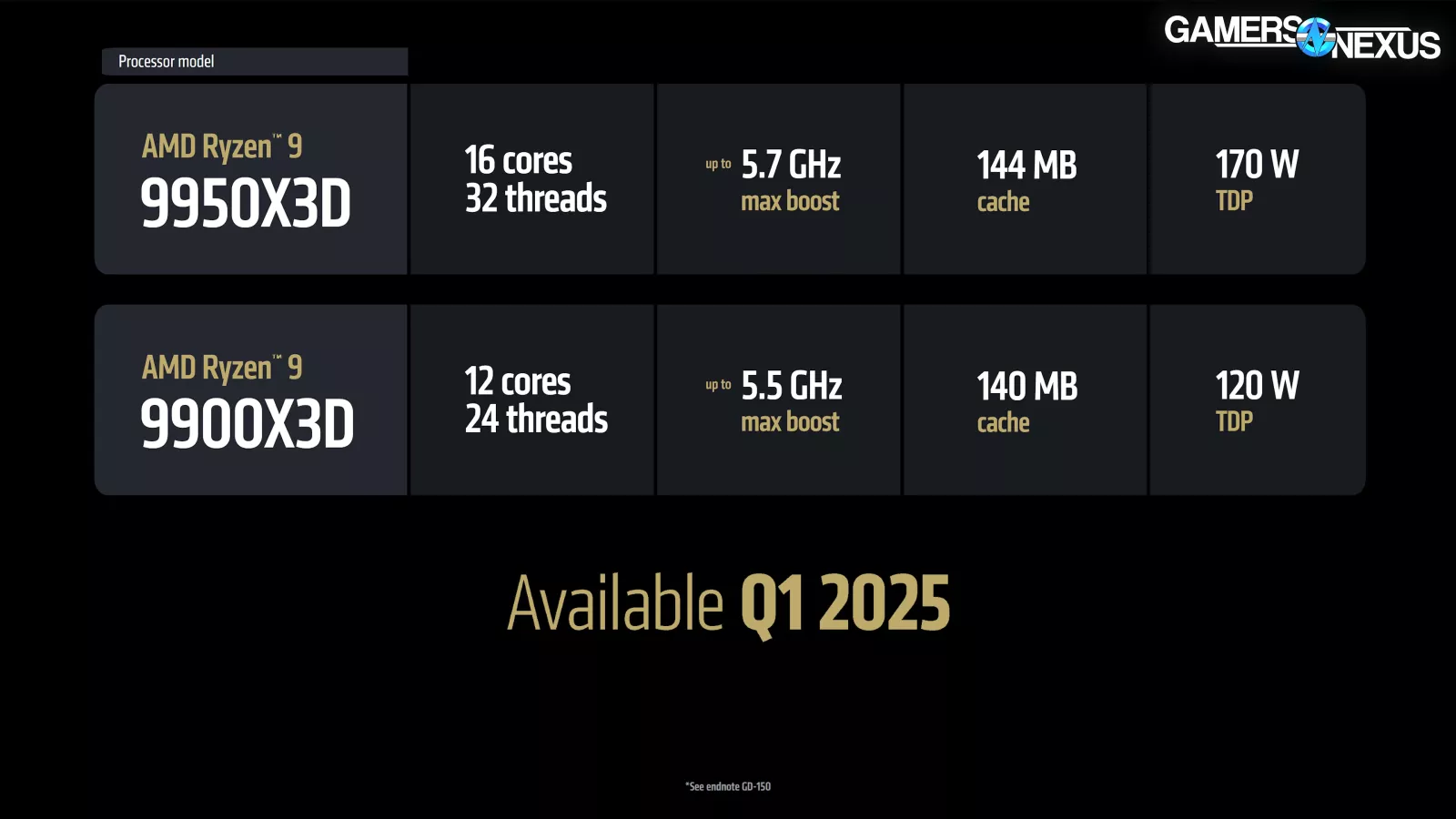 For comparison, the 9800X3D (read our review) has a total 104MB cache and $480 MSRP. The advertised boost of the 9800X3D is 5.2GHz, so the 9950X3D has a greater cache size and may benefit from higher boosting. The 144MB cache on the 9950X3D comes from the additional CCD in the configuration and could have some specific benefits that we’ll explore in our eventual review.