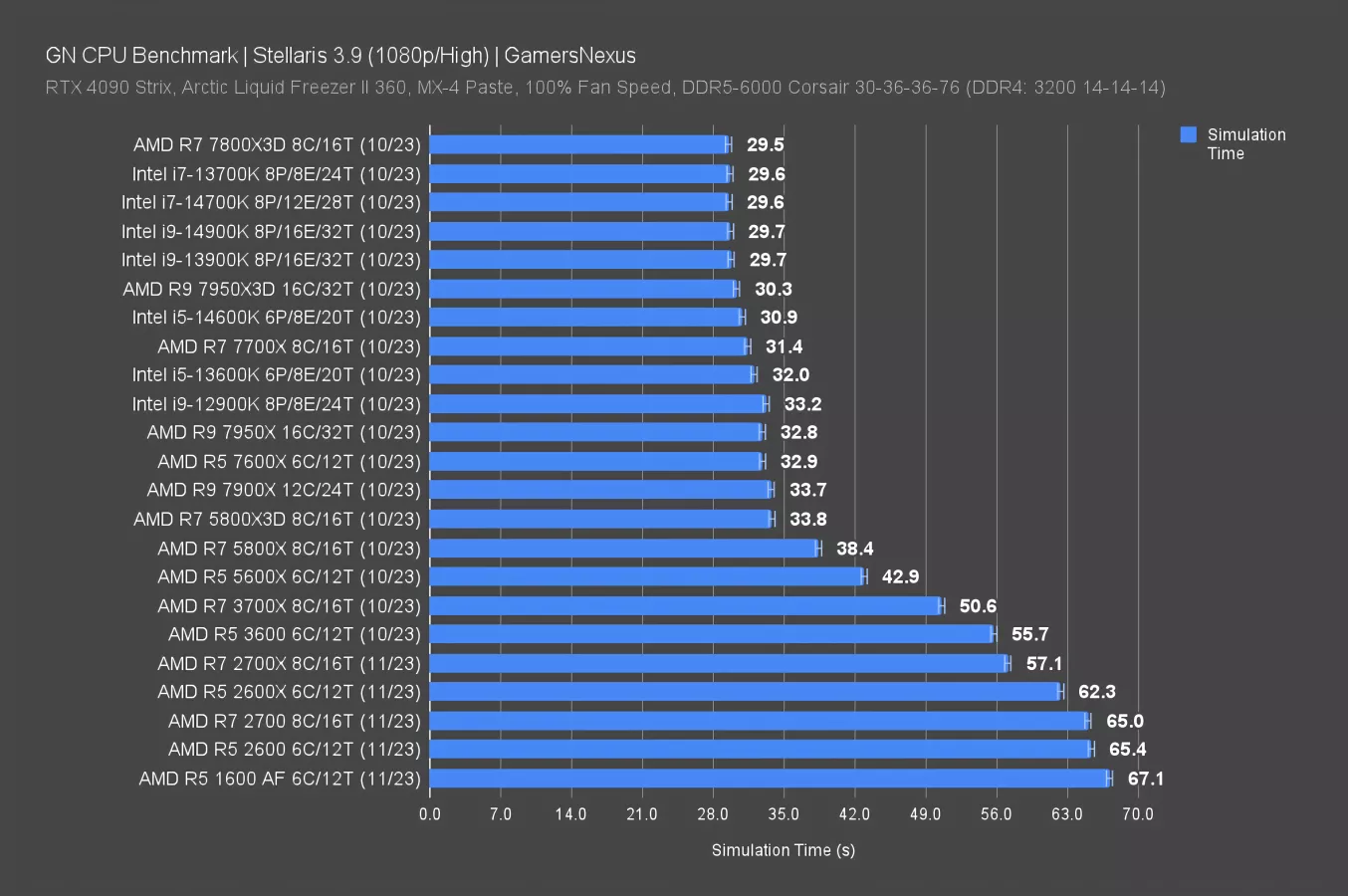 The 2600X shows us that frequency does have an impact here, and the 2700X vs. 2700 comparison teaches the same lesson. 3D Cache benefited the 5800X3D over the 5800X, where we saw an uplift of 12% time reduced, but didn’t meaningfully help the 7800X3D over the 7700X as a result of encountering other limitations -- possibly engine limits.