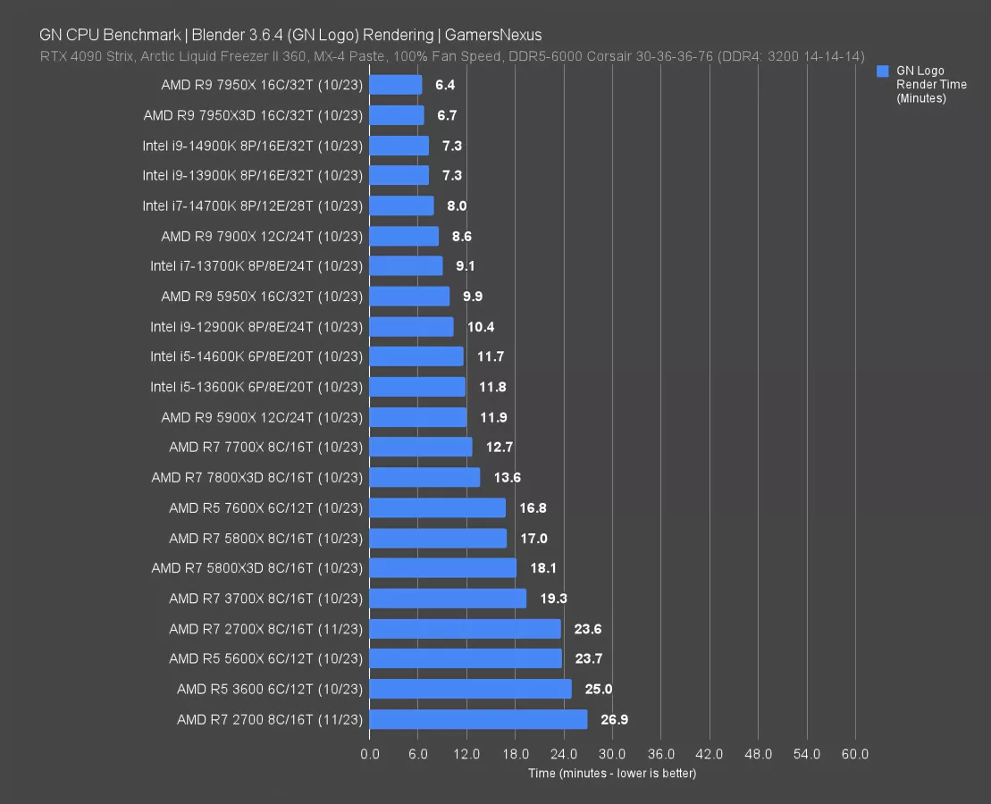 The R7 2700 required 27 minutes to render a single frame of the GN Logo. The best result here is the 7950X, which reduced the time required by 76%. In other words, in this test, you could render 4.2 frames on the 7950X for every 1 frame you render on the 2700. That’s a huge improvement.