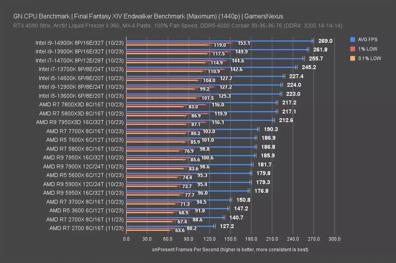 Here’s the chart. FFXIV’s benchmark test is interesting mostly because it has favored Intel’s CPUs for a long time now. The 7800X3D and the 12900K mark the start and end of compartmentalized AMD and Intel sections, with Intel holding a generally strong advantage. We think some of this is due to GPU driver behavior as well.