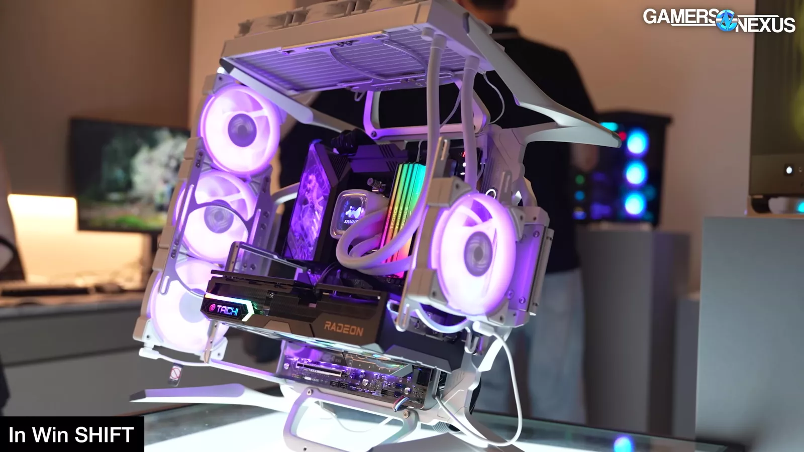 Hyte showcased its new X50 case, which is its most mechanically complicated product to manufacture to-date. The X50 uses a bubbly external look while attempting to be the highest-performing case on benchmark charts. Hyte uses a front panel that’s perforated all the way around the apex of the turn, leaving only a small strip at the mounting point for rigidity. The case also has louvered slats at the back, including for the PCIe slots, which add mechanical and manufacturing complexity but strengthen the chassis structure while improving airflow performance. Hyte noted that its intent, which we’ll test in our review, is to help project air away from the system, highlighting that there’s always focus on reducing intake impedance but noting that exhaust impedance is similarly important.