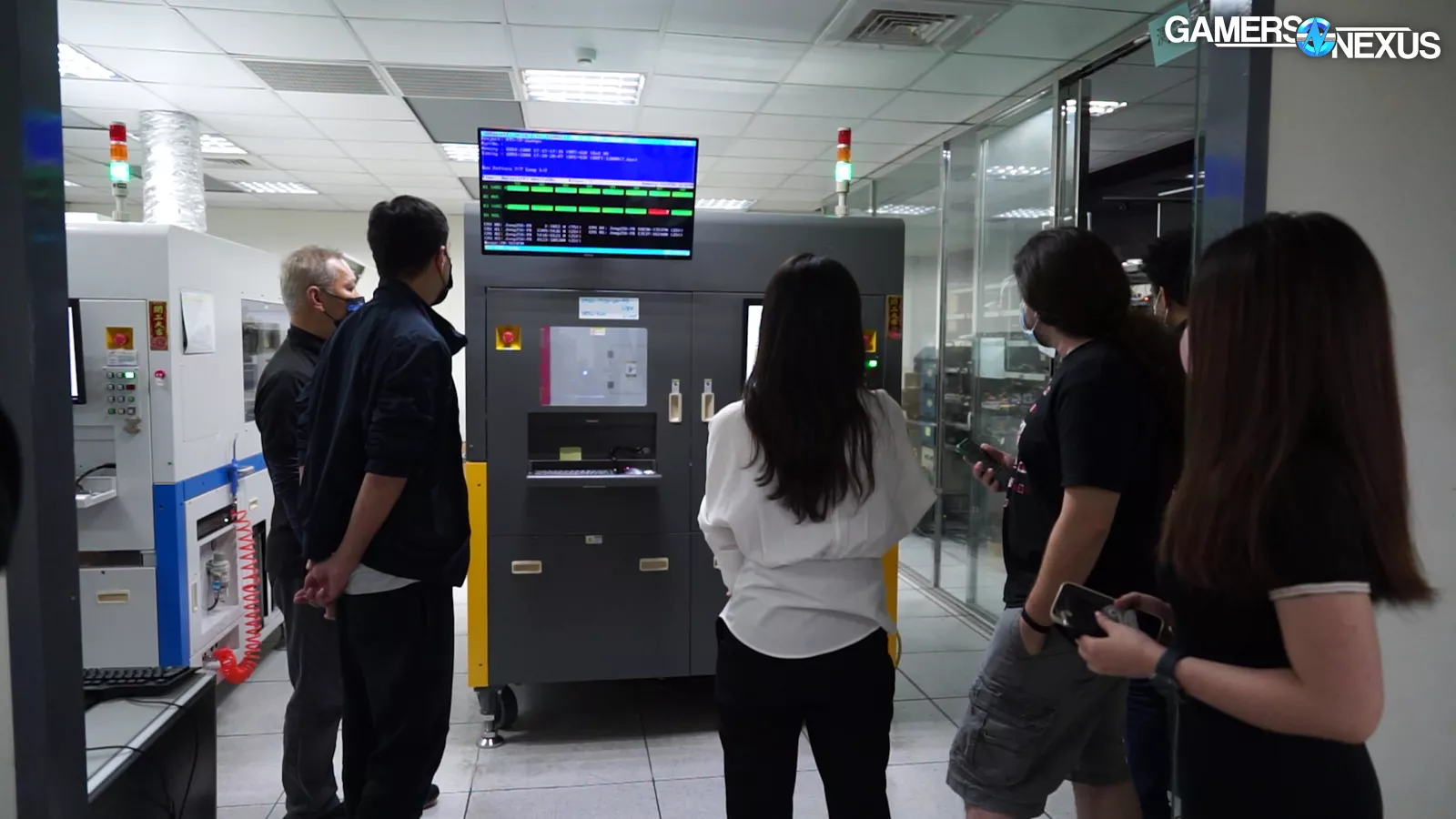We asked a few questions while watching these machines execute their work with ruthless efficiency: First, we learned that they can test up to 4 timings, alongside voltage and frequency tests, to expedite the process. We asked what the error rate is of the machine itself, and we were told “0%.” It never makes an error. That’s impressive.