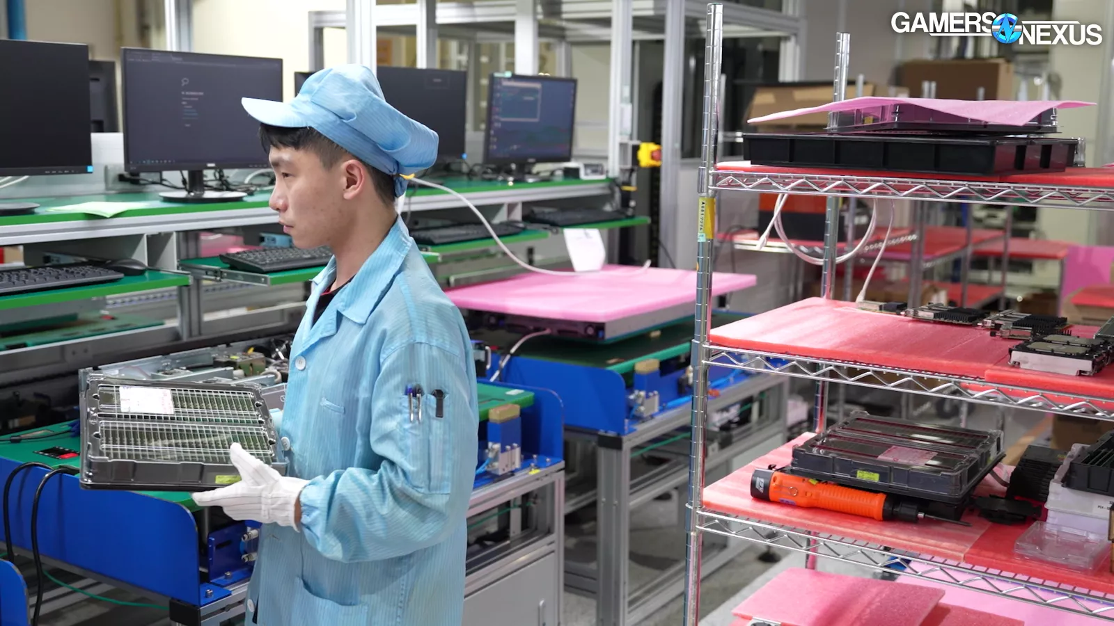 A different line is configured for 2U systems due to changes in process. For full configurations with maximized RAM, an assembly line crew might socket upwards of 1,000 sticks per day. We’re betting the job application asks how strong your thumbs are.