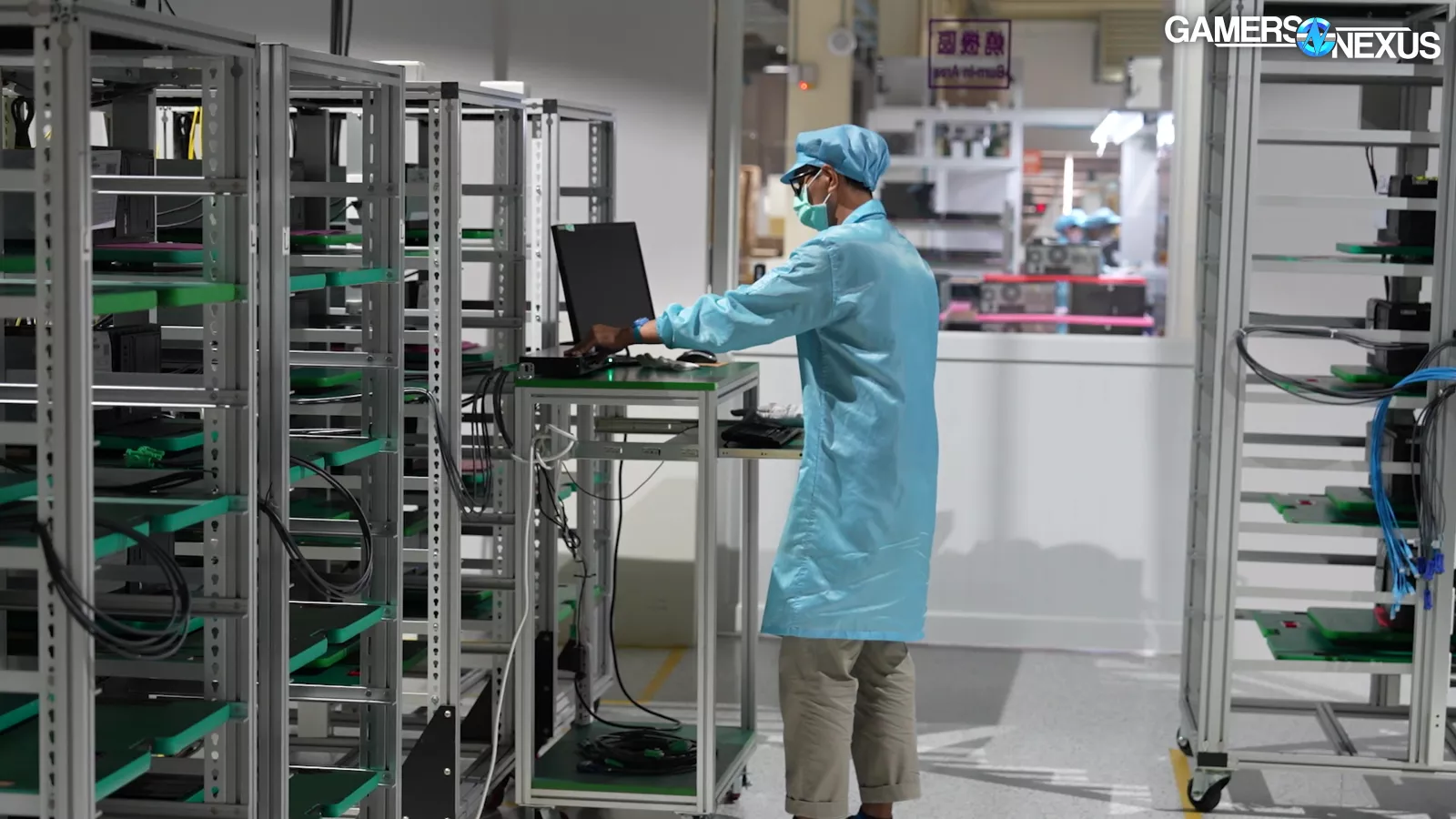 Total burn-in time is 2 hours per server at 10 units per rack. And one guy controls almost all of it -- meet the man with the most powerful index finger in the world, trained from entering BIOS hundreds of times per day.