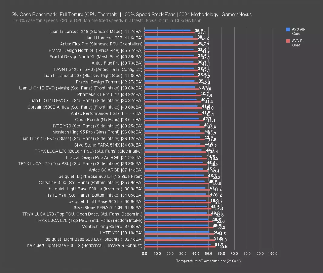50 degrees Celsius above ambient all-core and 54 P-Core ties the Antec C8 ARGB (read our review), but the King 95 Pro averaged 47 all-core, and cases with simple front intake like the Antec Flux Pro (read our review) and Lian Li Lancool 207 continue to dominate the top of the chart.