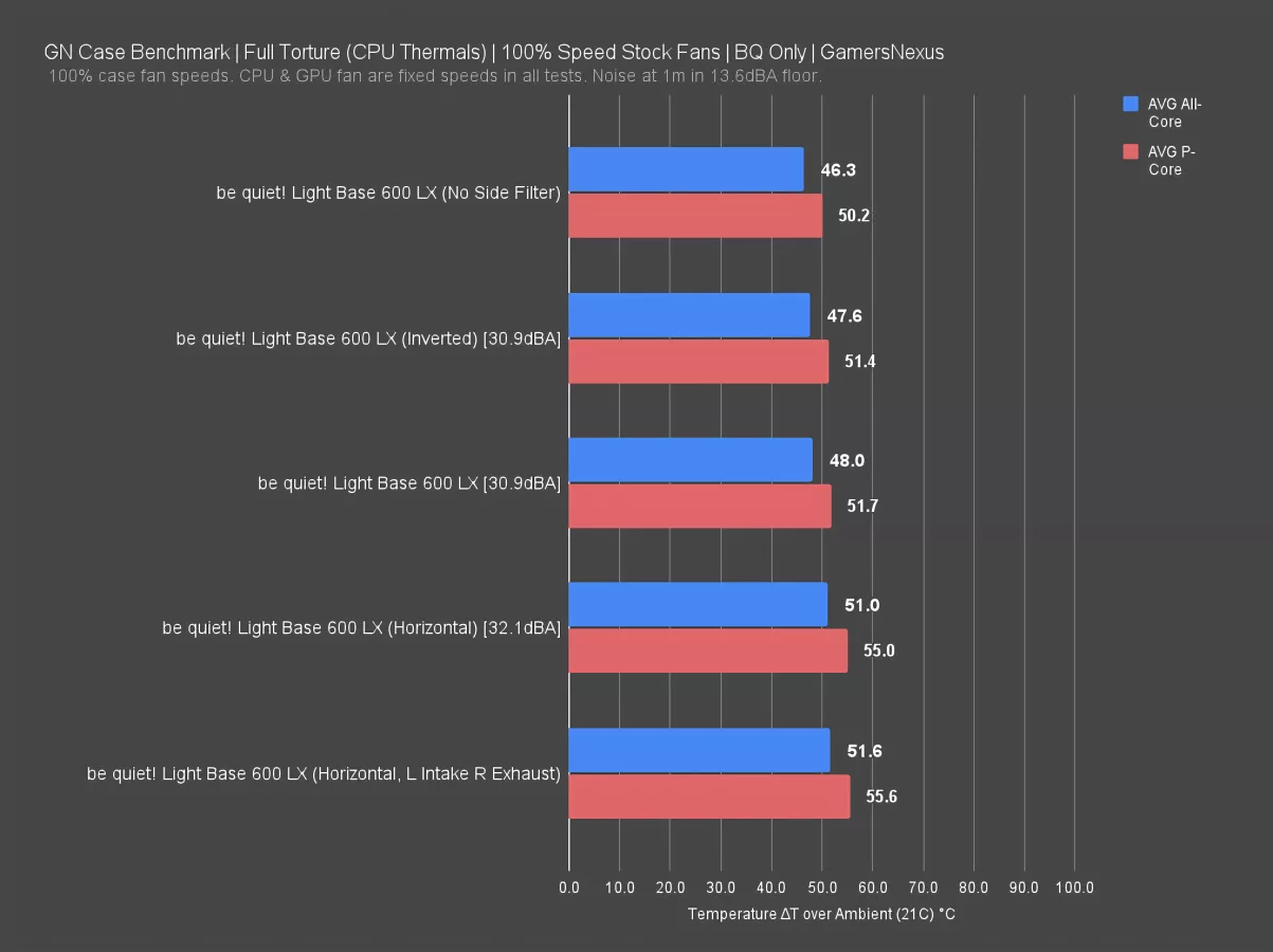 With all case fans at full speed, the Light Base 600 LX averaged 48 degrees Celsius above ambient all-core and 52 on the P-Cores in its default configuration. Removing the optional side filter reduced the all-core temperature by 1.7 degrees, which is a large drop for a side filter only. It’s relatively restrictive.