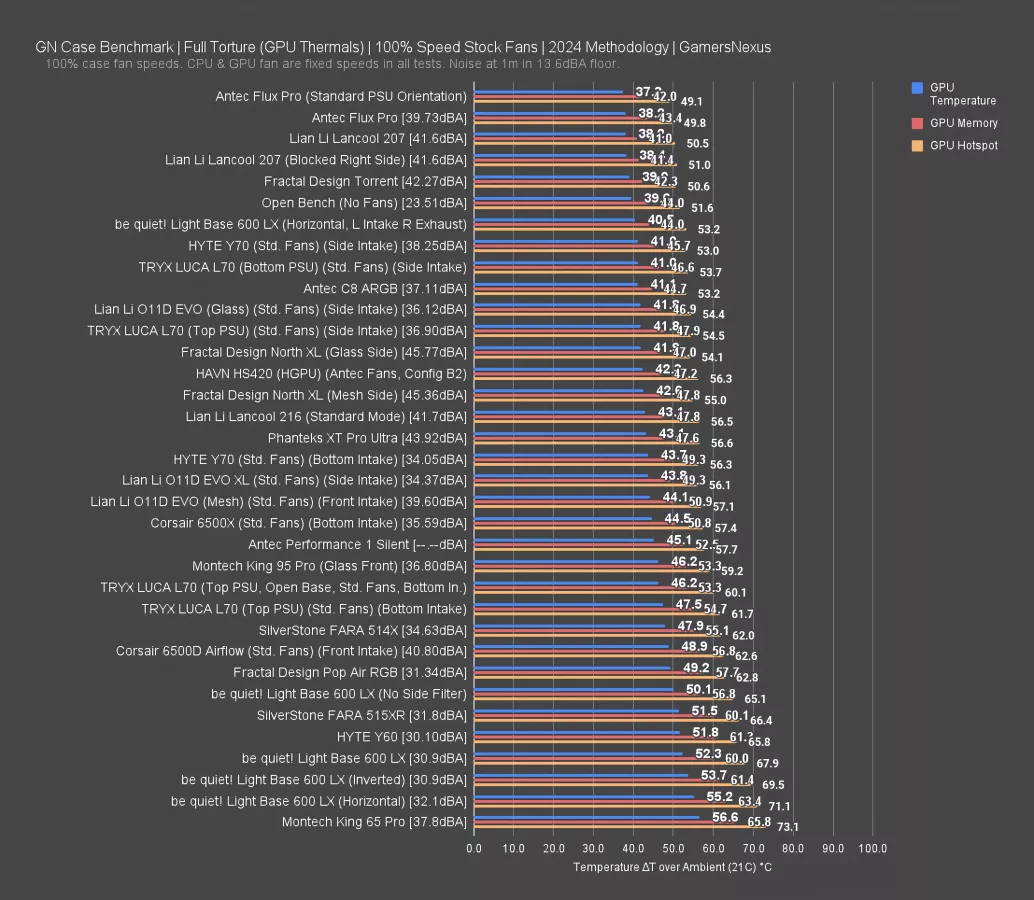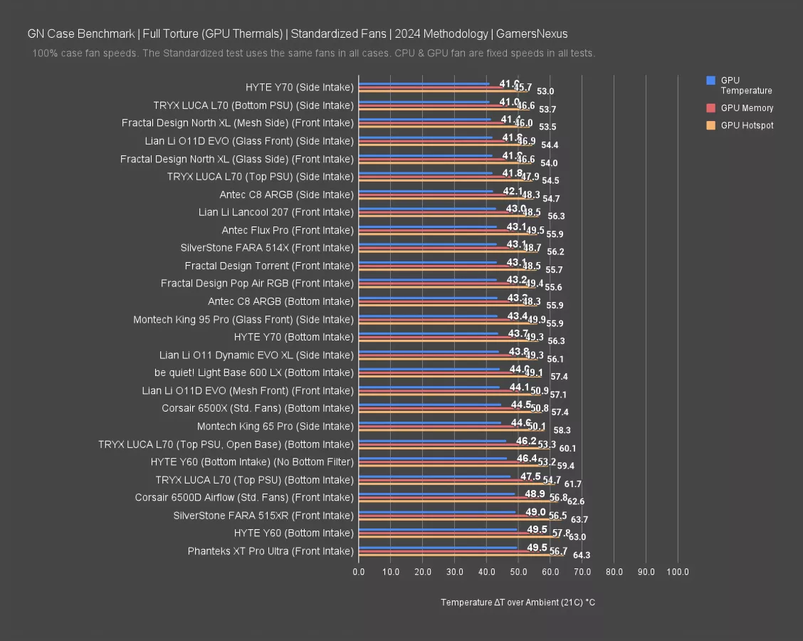 Here’s the competitive chart. All of the results with the fans in their stock locations are among the weakest on the chart, with the baseline out-of-the-box result falling behind even the Y60. The left intake/right exhaust configuration performed significantly better, tying the C8 ARGB's 41 degree GPU average and significantly outperforming the King 95 Pro's 46 degree average. As a reminder, this was done with just the included fans. All we did was move them. We didn’t want to add fans because it starts to become arbitrary and potentially unfair, but moving them really helped here. The horizontal configuration has the greatest potential for cooling, since a clear unidirectional airflow path can be created without obstruction. You’re not dealing with angled intake from the side, so there is a huge amount of potential here.