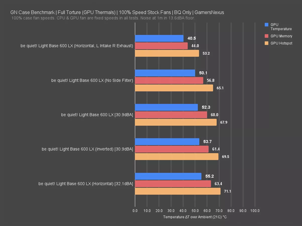 The Light Base 600 LX kept our GPU at 52 degrees Celsius above ambient with the memory temperature at 60 and hotspot at 68. Removing the side filter improved temperatures by 2.2 degrees for the GPU, which is a huge climb for just a filter. be quiet! has room to improve this area.