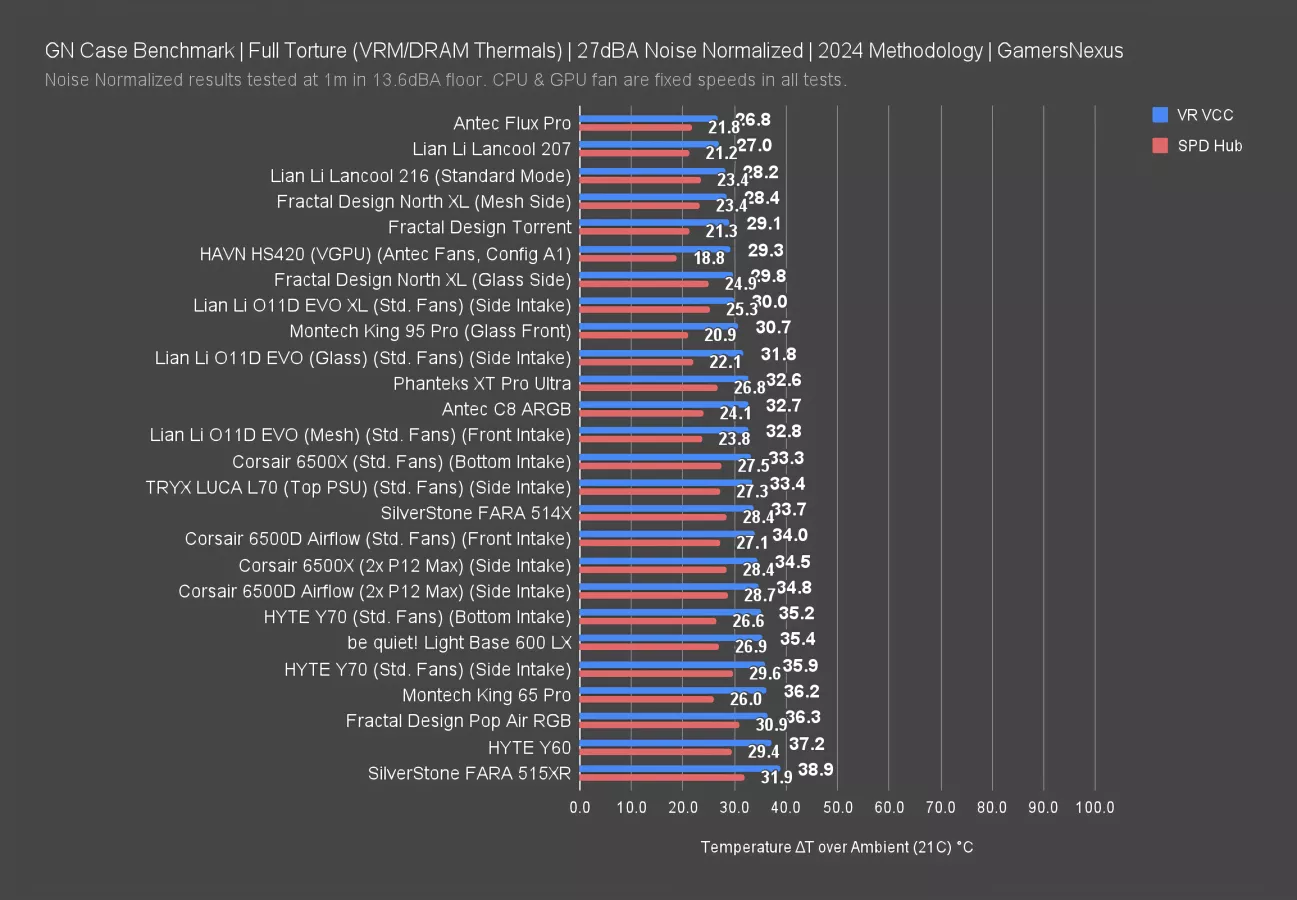 Finishing off with VRM and system memory thermals during the noise normalized test, the 600 LX's performance is again unimpressive. 35 degrees above ambient for the VRM is warmer than the C8 ARGB's 33 degrees and the King 95 Pro's 31 degrees, and although the stack is ordered differently for memory temperatures, both the C8 ARGB and King 95 Pro were cooler than the 600 LX's 27 degrees. We also know from our full speed results that these sensors didn't respond strongly to the horizontal left intake/right exhaust reconfiguration.