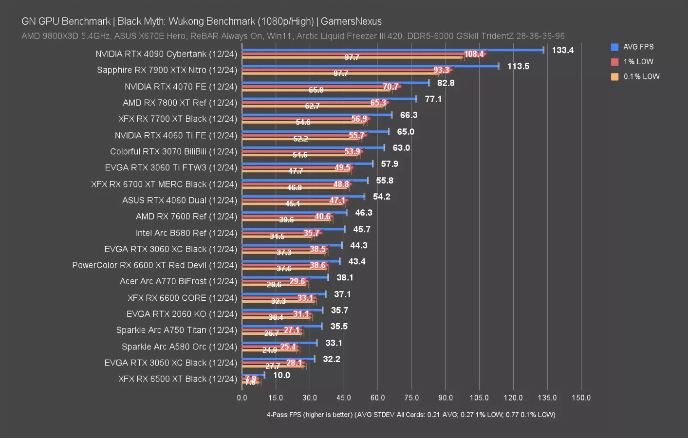 At 1080p and with FSR set to quality, using high raster settings and medium RT settings, the B580 ran at 34 FPS AVG, with lows where they should be. Intel’s last-minute driver change did nothing to our results -- they were nearly identical, so we’re just showing one set here. The B580 ranks alongside the RX 7800 XT (watch our review), as AMD has serious difficulties with this game. Wukong is similar in performance to Cyberpunk in its performance characteristics on AMD, where even a 4060 outperforms a 7900 XTX.