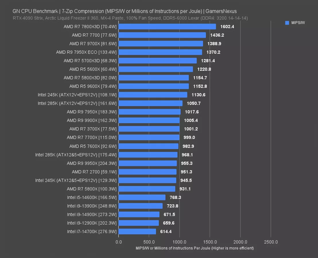 AMD remains the leader, with the 9600X at 1152.8 MIPS/W, the 5700X3D at 1281, and the 7700 non-X at 1436.2.
