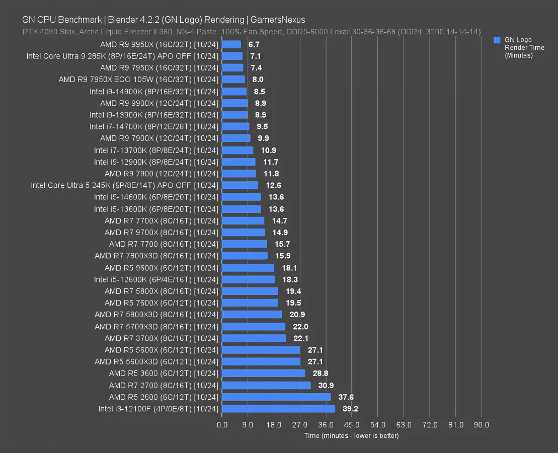 In Blender with CPU rendering, the 245K required 12.6 minutes to complete a render of a single frame from the GN video intro animation. That has it about a minute faster than the 14600K, reducing the time requirement by 7.4%. The 245K is beaten by the 14700K at 9.5 minutes, or a 24% reduction in time required. The 14700K (read our review) is $350 as we write this, which is a 13% increase in price over the 245K. The 285K was a relatively impressive performer in this test as well, with only the 9950X ahead of it. This is one of the few where Arrow Lake does OK in competitive scenarios.