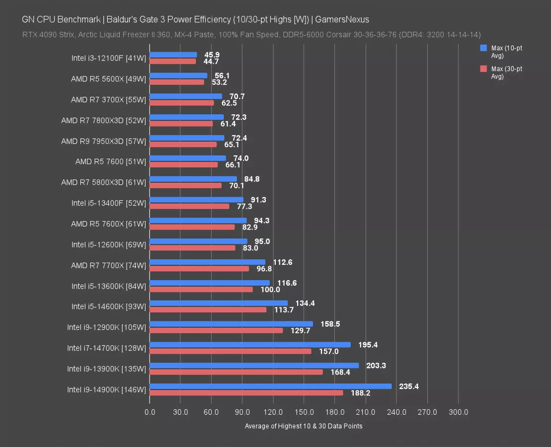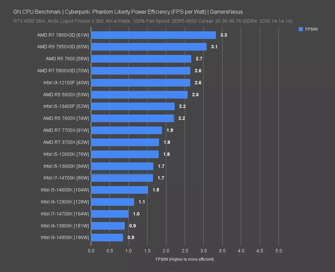 Here, the 14900K still pulled 190W, with the 7800X3D at 72W. The 7800X3D remained the more efficient of the CPUs. Framerate overall has come down, not only because of the CPU, and so it is natural that the FPS/W figure dropped. That’s normal with a settings quality increase and you can’t directly compare these numbers to the prior chart unless you’re comparing graphics efficiency cost, but comparing the two CPUs to each other does show that the hierarchy remains the same.