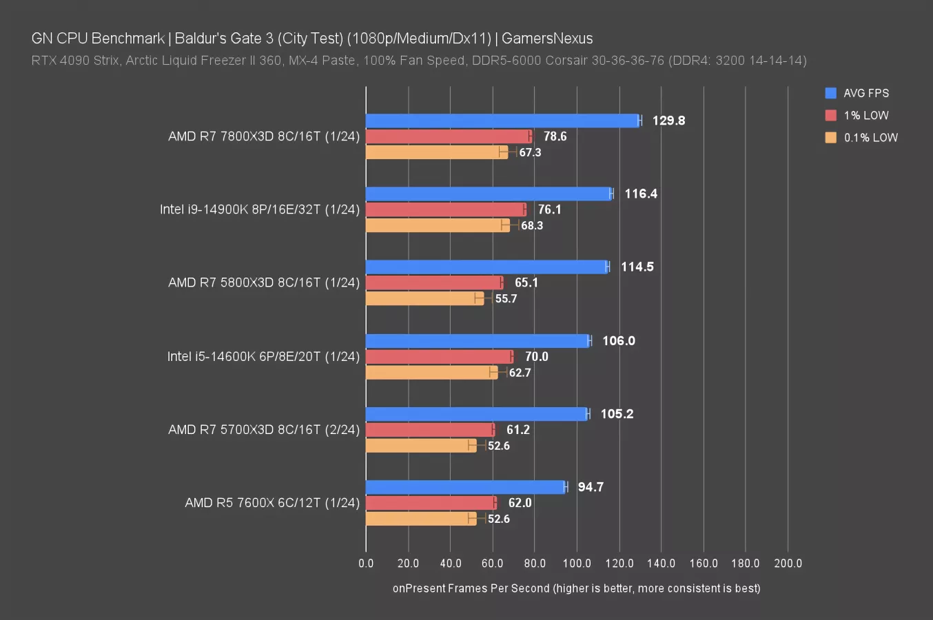 Baldur’s Gate 3 has also received multiple massive patches since our October data set. We found that CPU performance was typically around 5% different from previously at the upper-bound of the testing, or 2-3% at the lower. Because of the 5% swing in some scenarios, this chart contains only directly comparable data that has been run on the newest game version.