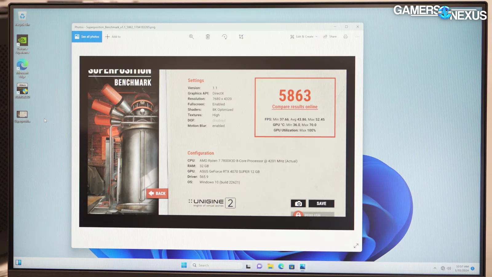 Windows setup was normal, thankfully devoid of any third-party software agreements deceptively tacked on at the end. Booting into Windows was clean, without any pop-up app assault. The desktop had a screenshot of a Superposition benchmark result, indicating the system was probably tested prior to packaging. Having a result stored locally for the customer is excellent, as it offers a means to calibrate against the expectation and gives customer support a way to help direct the consumer to a performance gauge.