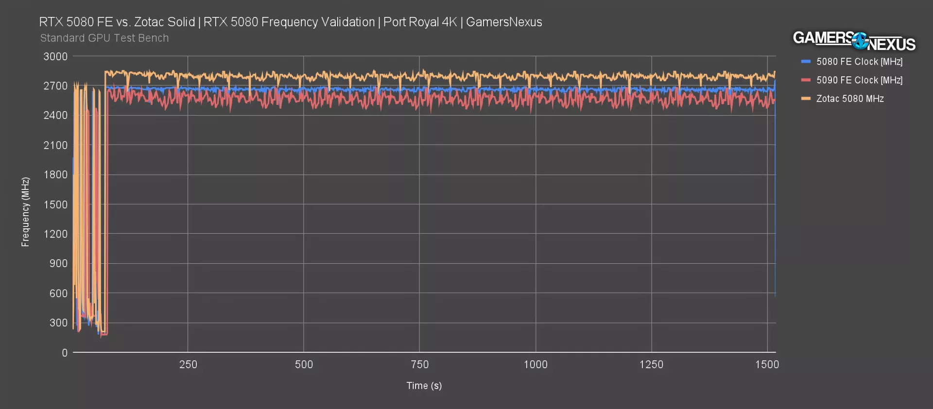 Adding the Zotac 5080 solid to the chart, its clock is higher than the NVIDIA FE model, landing at 2790 to 2842 MHz. This is a pretty significant uplift. We’ll test that in some performance scenarios momentarily to see what it actually does.