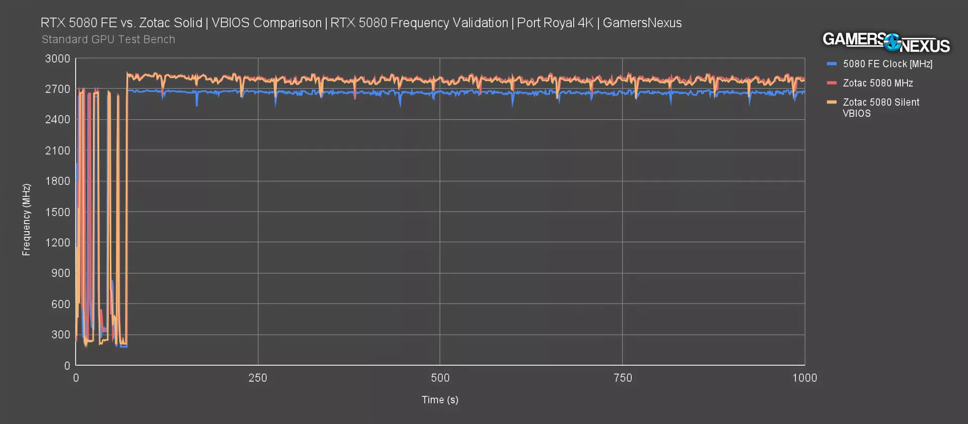 This is a quick VBIOS comparison for the Zotac 5080 Solid. Between the two VBIOS options, frequency is almost completely identical. There is no meaningful difference.