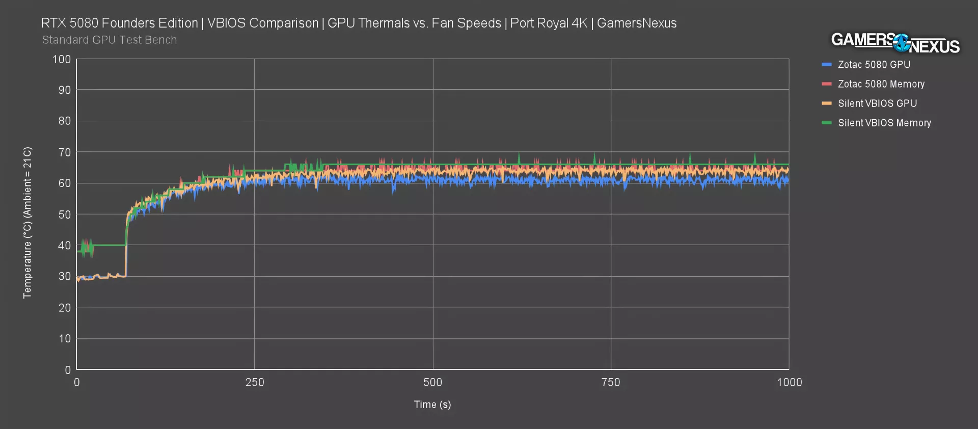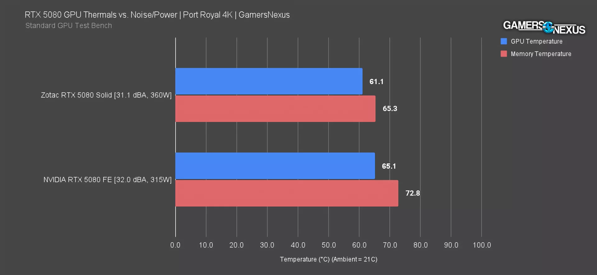 This chart shows the 5090 Founders Edition and the Zotac 5080 Solid. The 5080 Founders Edition is mostly equivalent to the 5090 Founders Edition, with the exception that the fan curve runs slightly slower and so the noise is reduced by about 1 dBA in our workloads.
