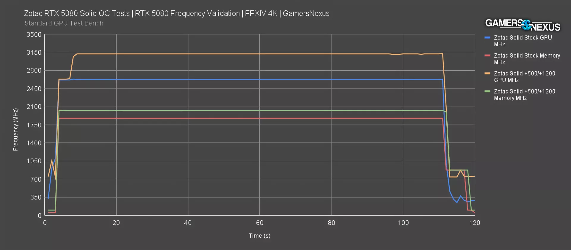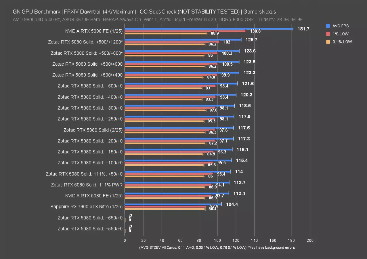The stock 5080 FE ran at 112 FPS AVG. The 5080 Solid, out of the box, ran at 117.5 FPS without any background applications. We saw performance degradation when we began running Zotac’s utility in the background in addition to changing the clocks and fan speeds, so just increasing the power offset and applying up to a 200 MHz core offset resulted in performance equal to or worse than stock. We were able to run the Final Fantasy benchmark with stability up to a 500 MHz core offset and 1200 memory offset; however, we’re not certain if there are any invisible background issues with this memory offset especially out of this game.