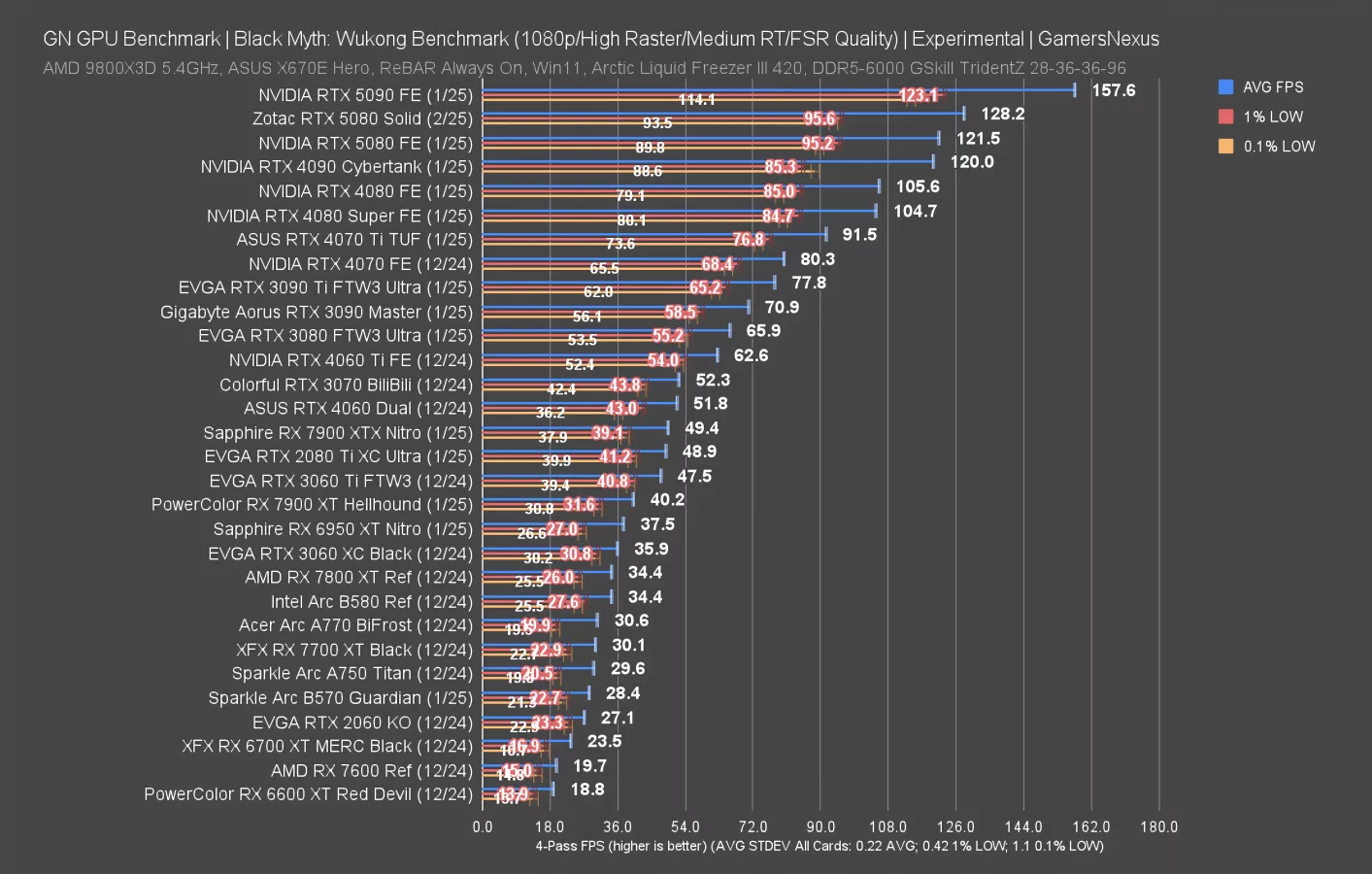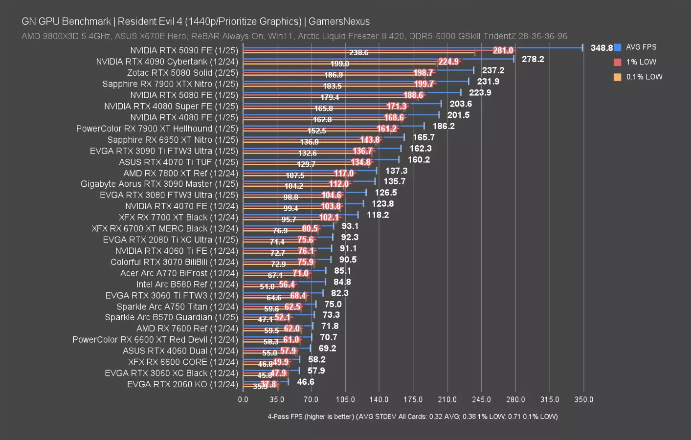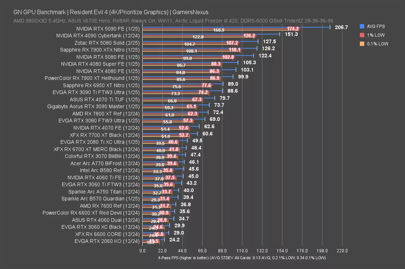 In Resident Evil 4 at 4K, the RTX 5080 Solid ran at 128 FPS AVG and led the 5080 FE by 4.2%. That’s not a bad uplift, but it’s bad for almost $300 more, though. Lows are within usual variance and benefitted similarly.