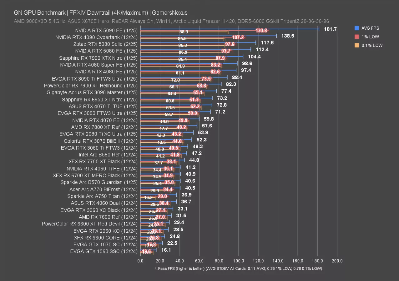 The next testing was only done for a performance check. We did not burn this in for stability, so we want to really heavily emphasize that this overclock is not stable in all games we test. It was only stable in Final Fantasy XIV: Dawntrail at 4K. You’d have to spend time tuning it down to dial it in, but we wanted to present what we found so far.
