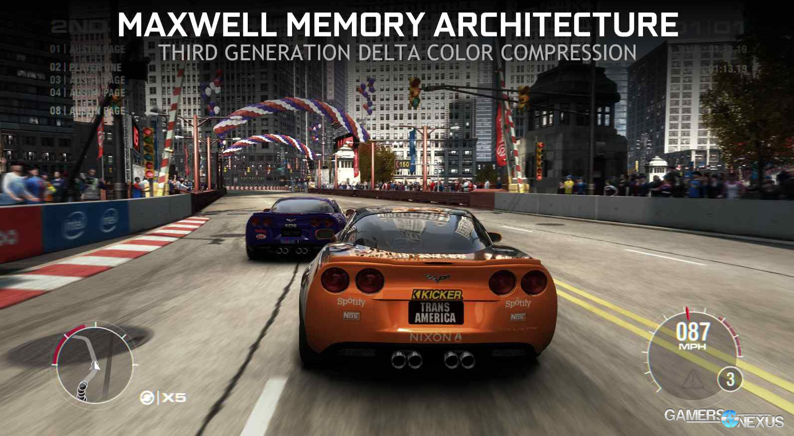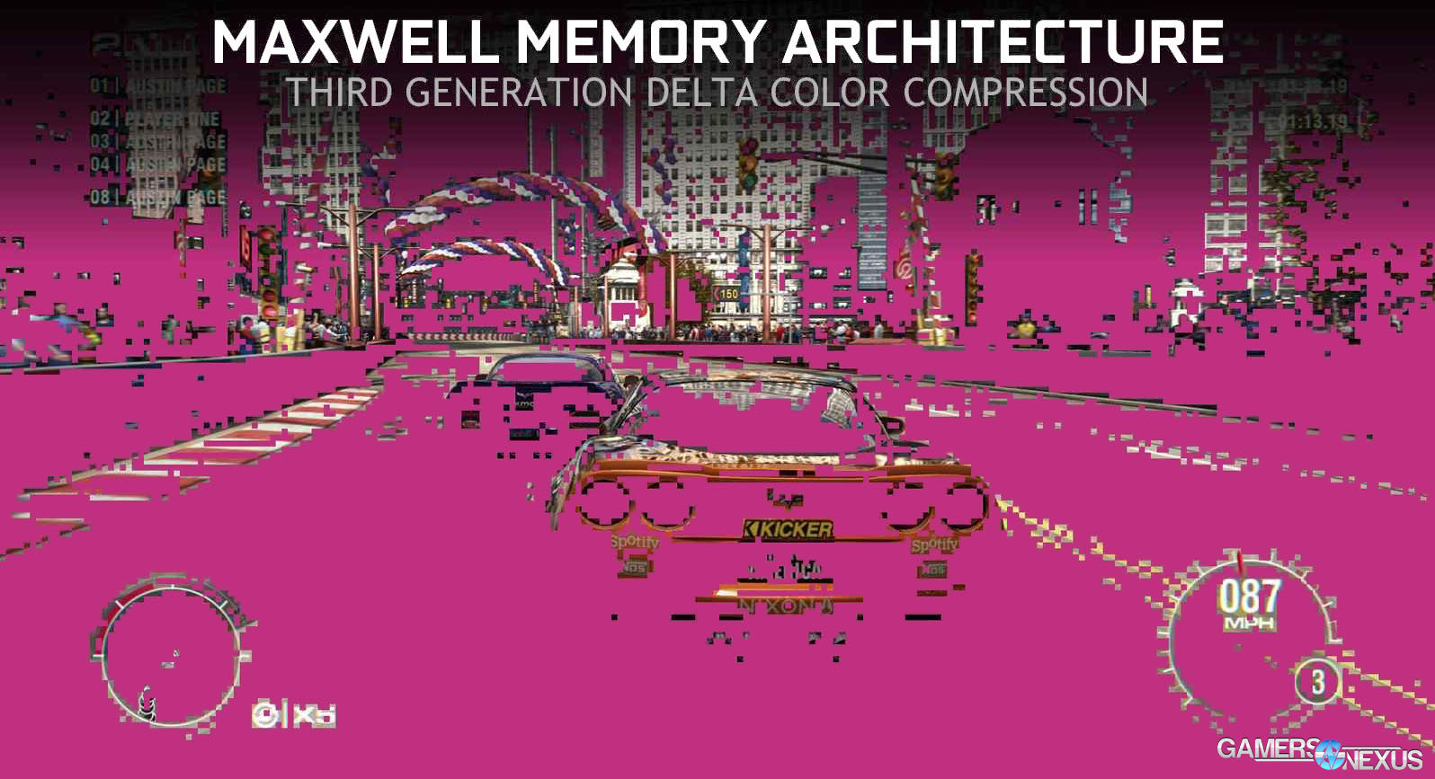 For those who didn't see this in our GTX 980 review, the top-level is fairly simple. Delta color compression analyzes pixel color temporally, frame-to-frame, and calculates a delta value output when drawing the pixel's new color. To this end, the GPU modifies color values only when there is a change, and even then, it further reduces workload by functioning on delta values rather than absolute values.