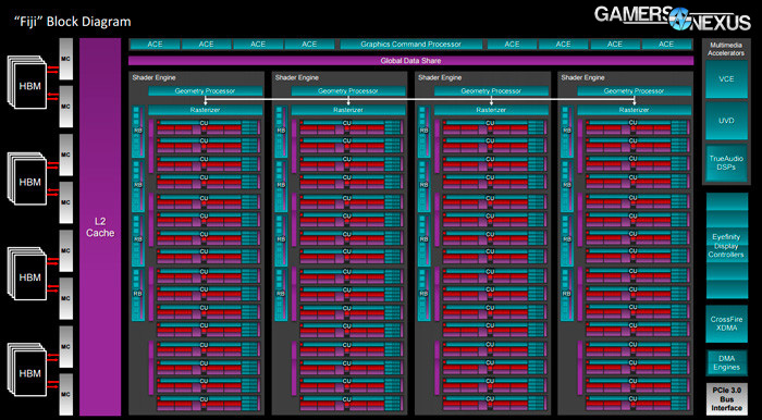 Fiji's SIMD uses a 64 asset-wide wavefront, providing a huge amount of lane potential for pixel and vertex shaders, depending on width of each. This grants GCN some versatility and theoretical advantages for multi-purpose use over Maxwell's gaming-targeted 32-wide warp (nVidia's name for “collection of threads”). This is part of why we see COMPUTE-bound users on nVidia often favoring Kepler architecture to Maxwell. For AMD, algorithm-level tuning of SIMD lane sharing will grant advantages in OpenCL for data structures, but doesn't do much for gamers. This contributes to the root-cause of the AMD-nVidia performance disparity in COMPUTE and gaming applications.