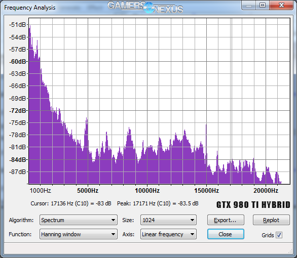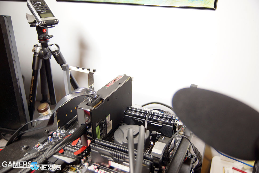 A rough one-foot distance from the DUT (device under test) is necessary for user representative acoustics data. We also tested with a sensitive microphone mounted atop the memory for a 1.75” distance from the AIB, but the results of such a close measurement are in no way representative of what an end user would encounter, even on an open bench. This would be the equivalent of placing your ear against the backplate of the video card (do not do this). The additional layer of audio logging was used as a means to validate our own testing and offer redundancy. The proximity allowed us to hear the actual liquid exchange within the chamber of the 980 Ti Hybrid, which is more of a curiosity than an actionable dataset. This will be played-back in our next YouTube video.