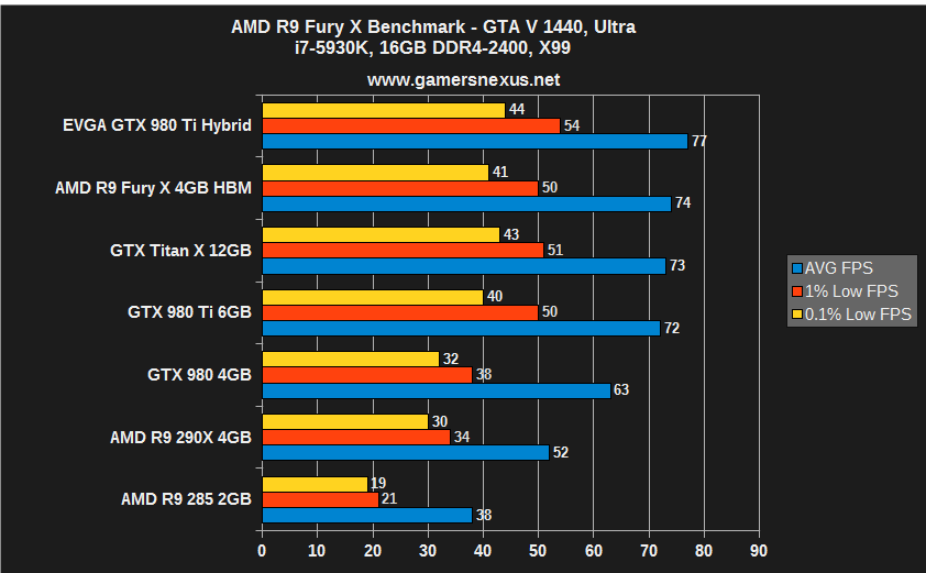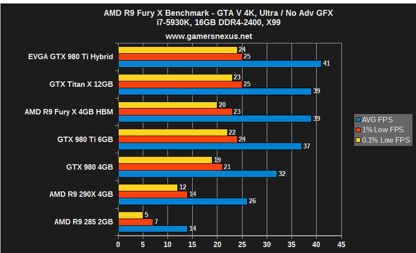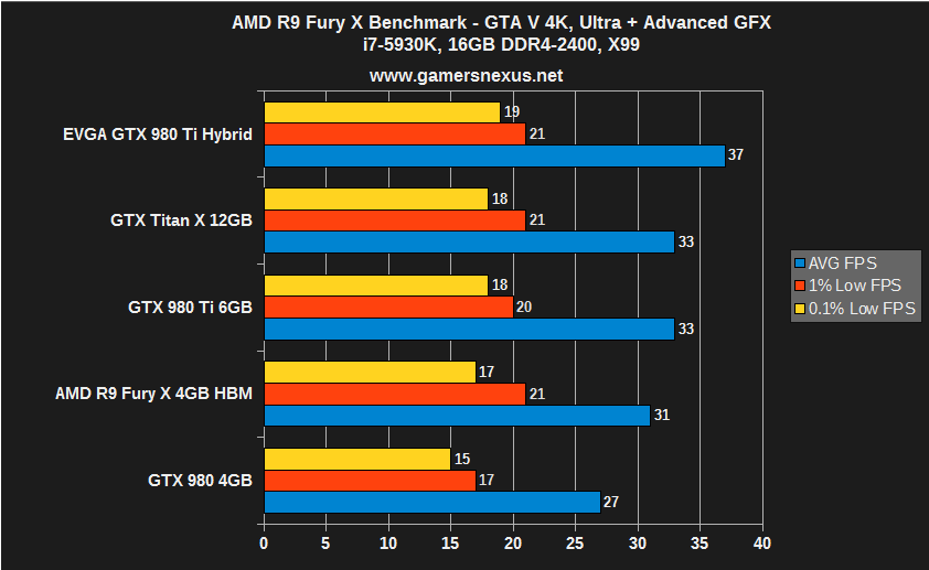 AMD's R9 Fury X ($650) makes architectural strides to plant AMD firmly into striking range of nVidia's own Titan X killer – the GTX 980 Ti, now priced at $650. The neighboring GTX 980 is outmatched by both devices, but offers a competitive $500 price point. AMD just launched a Fury (non-X) card today for $560, but we haven't had a chance to look at it just yet. HBM represents the immediate future of GPU memory and will likely make an appearance on nVidia devices in the future; AMD has represented ATI's legacy well by being the first to institute HBM but, unfortunately for AMD, it just doesn't offer a relevant performance gain in today's gaming market.