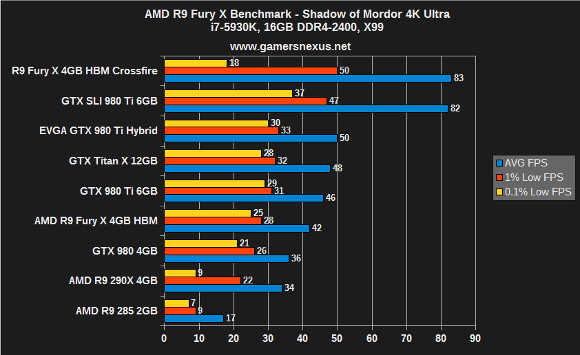 The below benchmarks show AMD's Radeon R9 Fury X vs. the GTX 980 Ti. Further testing pits the Fury X in 2-way CrossFire against the 980 Ti in SLI. We performed overclocking tests further down.