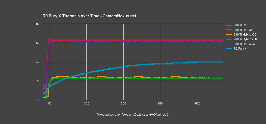 Again, we're using dT over A for these charts. The thermals shown are over time, providing greater insight to the burn-in time and time required to meet equilibrium for each solution. We only recently started producing these charts, so everything featured is from the Hybrid review. The reference 980 Ti is also shown at clock-for-clock (C4C) ratings against the Hybrid.