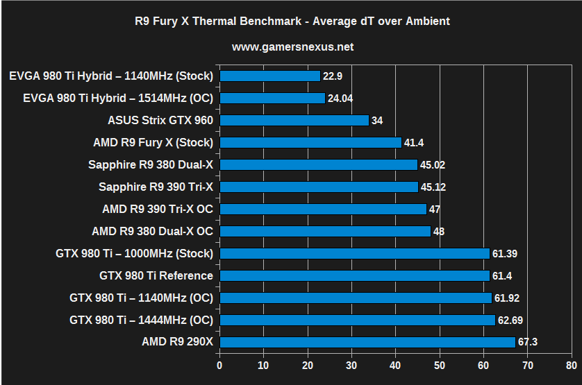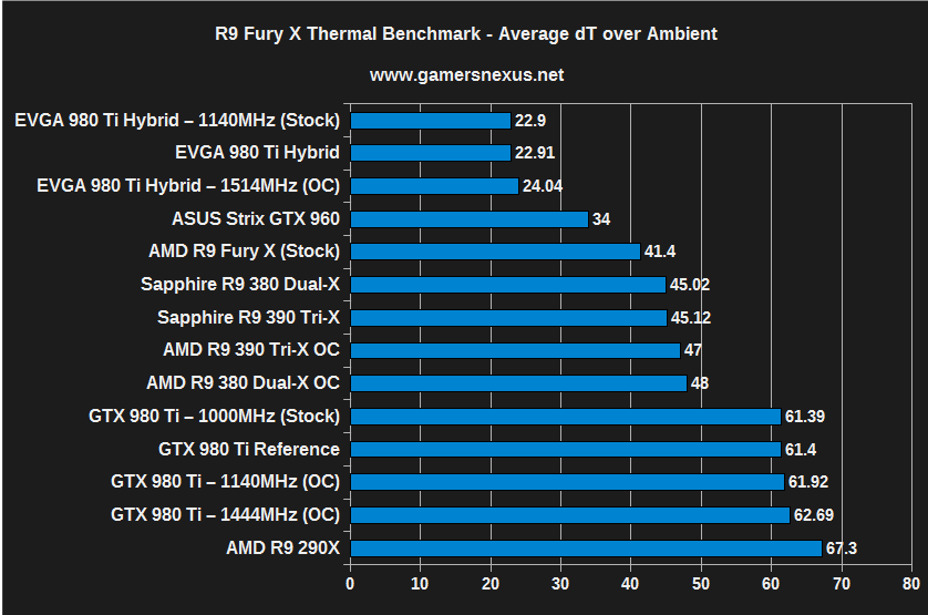The EVGA 980 Ti Hybrid is the key differentiator for this benchmark. Both the Fury X and 980 Ti Hybrid utilize CLCs for thermal dissipation, but execute their cooling solutions in a markedly different fashion.