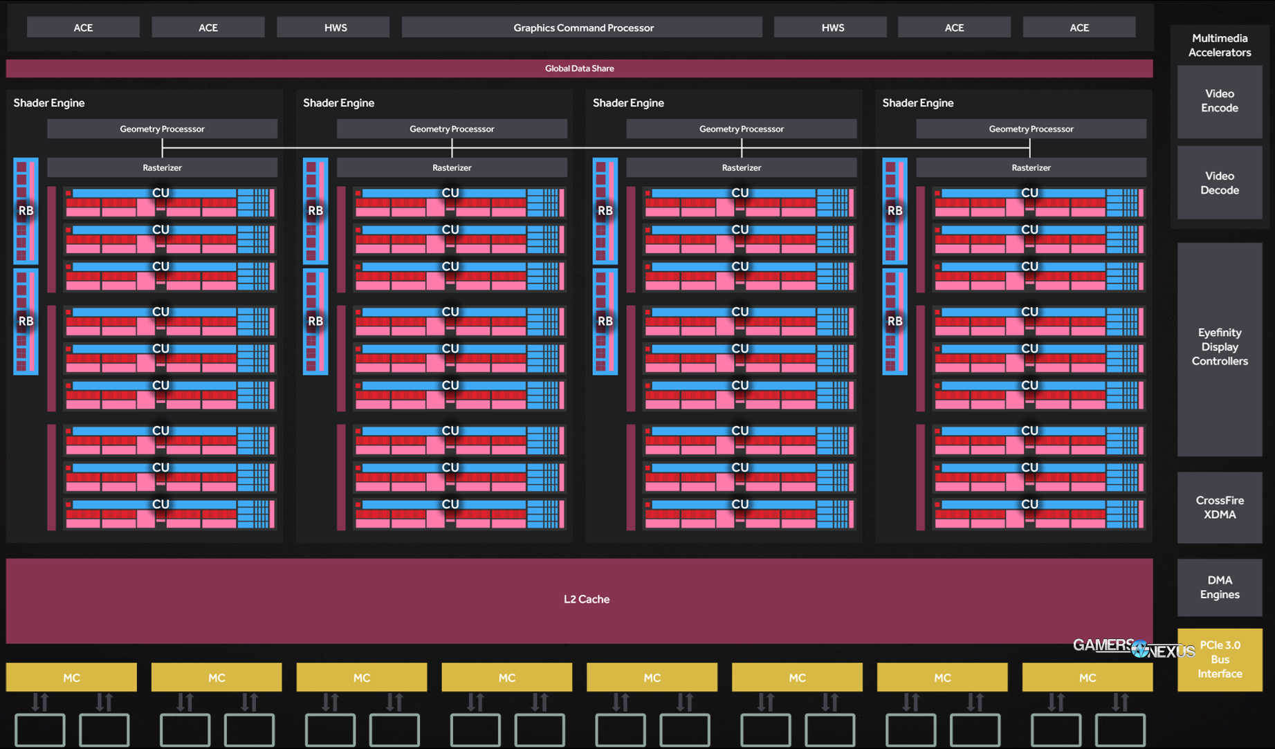 “Critically, this also has a side effect which is perhaps overlooked: Energy savings. Along with the power reduction native to smaller FinFET process nodes – moving away from planar helps tremendously – the caching system reduces power consumed by GPU memory. Delta Color Compression (DCC) and 2MB of L2 Cache work in conjunction to minimize VRAM activity, and while it is impossible for us to test something this low-level at GN, AMD tells us that power savings are upwards of 40% on memory transactions alone.”