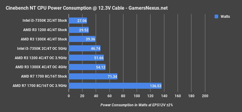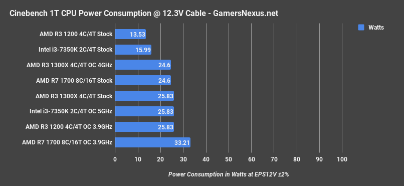 Moving next to FireStrike’s physics test, another real-world scenario, we see power consumption at about 27W for the R3 1200 and 44W for the overclocked variant, drawing more than the 7350K in part because of the additional physical hardware for the 4C configuration. Architecture, of course, is also vastly different between the two. The R3 1300X lands at 38W stock and 47W when overclocked. Just like with the R7 CPUs, overclocking is a great equalizer for AMD’s SKUs.