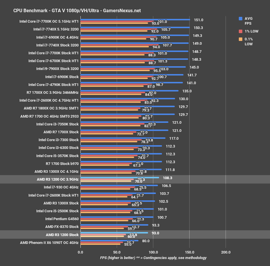 As ever, we look at components primarily from the perspective of a value argument. Gaming performance drives this argument best, as that’s where buyers tend to care most about value proposition mapped to performance. The AMD R3 CPUs instantly land themselves in a particular class of CPU that’s budget-targeted, given the price, and so map most adequately versus existing i3 and Pentium parts. Ultimately, we do draw some comparisons upward and toward the R5 series – it’s not a far stretch, and production performance bolsters tremendously – but go no further than that in text. We’re assuming that most buyers of R3-class parts are likely not interested in an R7 or i7 CPU. The numbers are still present in the charts, though.
