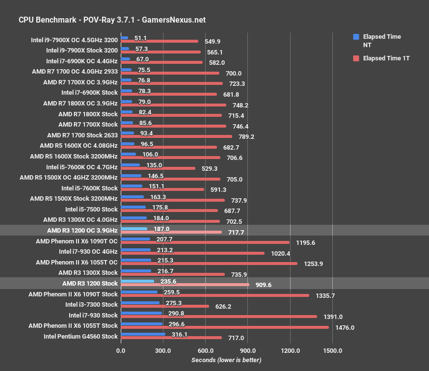Blender wasn’t stable with our 3.9GHz overclock, so we stepped down to 3.8GHz for this particular test. The R3 1200 stock CPU completes the scene render in 102 minutes, so it takes 14% longer to render than the stock 1300X, and overclocking gets the CPU down to 87 minutes – about tied with the 1300X. Because we’re down to just 4C/4T on these R3 CPUs, performance here isn’t exciting. It’s not bad, as stated in our 1300X review yesterday, but it’s also just not that interesting. If rendering really is of interest, and if using a CPU for rendering is on the agenda more than infrequent intervals, we would still very strongly encourage an R5 1500X or 1600 purchase. The cost is higher, but the render times are halved as we approach overclocked R5 1600 territory. That’s a major savings in time for anyone rendering even in light freelance capacities, so it’ll recoup the loss quickly.