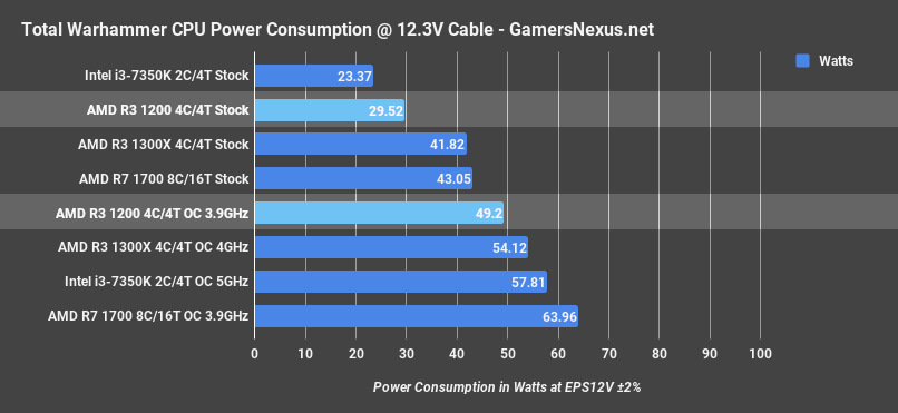Total War: Warhammer is next. The R3 1200 runs the game at 30W peak during the benchmark with the 1300X stock CPU at 41.8W. The overclocked variants draw 49W and 54W, respectively. Again, we’re well within reasonable power consumption metrics for parts of these specs.