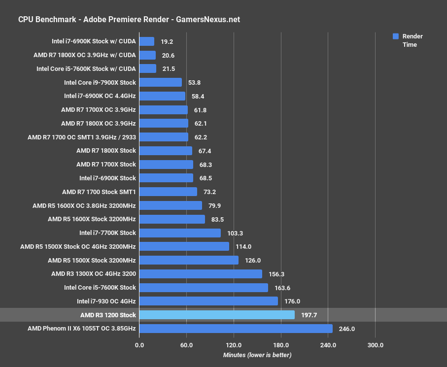 Adobe Premiere Benchmark – AMD R3 1200 vs. R5, i7 CPUs