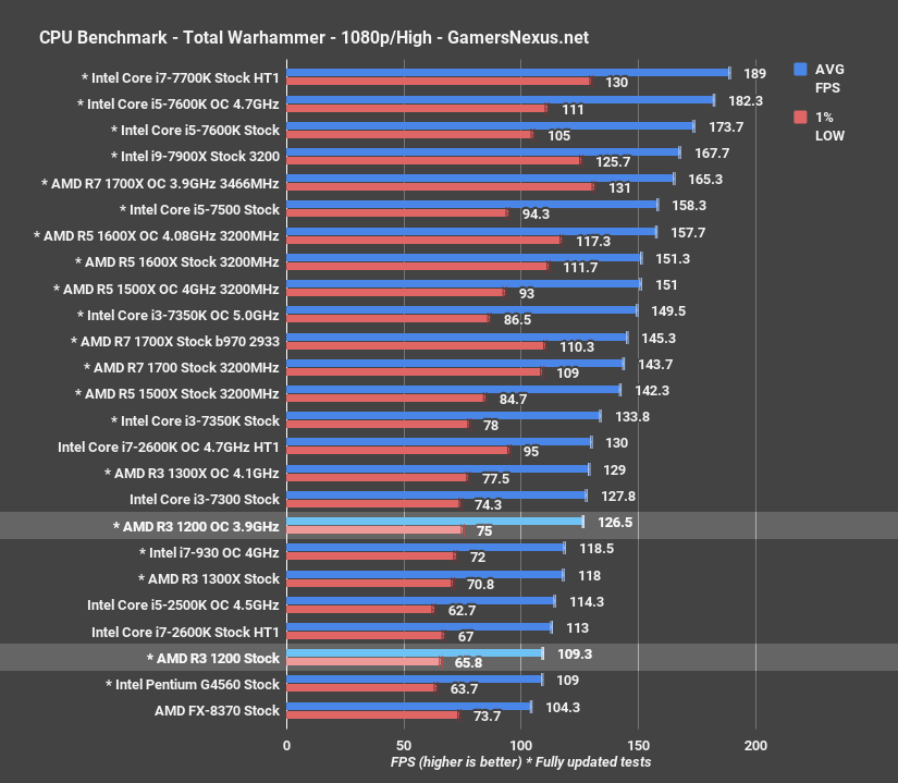 The Pentium series still exists in the sub-$100 class, and still performs excellently in the games we’ve tested. We previously ran a GPU bottlenecking test and found that the G4560 pairs well with GPUs up to 1060 or 570 class hardware. That hasn’t changed, and the G4560 remains our go-to for ultra-budget builds. The R5 1600X CPU still remains our top choice between the i5 and R5 class, so that leaves a gap between the G4560 and the R5 CPUs. The R3s kind of fill it, but the performance isn’t as exciting as the R5 CPUs. It’s not bad, just to be very clear: Saying something “isn’t exciting” is not synonymous with saying it is “bad” or an unworthy purchase, and anyone thinking otherwise may need to temper the expectations a bit. To say something is adequate is not insulting in and of itself, but we also don’t need to feign excitement for a product which is just, well, adequate. It’s fine. The R3 1200 is certainly far more interesting than the 1300X, in our eyes, and overclocks to become a competitive performer at the price. The CPU does well in testing and is positioned competitively in the market, largely invalidating the 1300X when overclocking is permitted. It also isn’t so good as to drive sales away from the G4560 in ultra-budget machines, nor to convince users to step down from an R5 purchase. Just like in the 1300X review, we’re still recommending the R5 CPUs as the preferred option. If the monetary gap can be bridged – a lunch skipped, a game unpurchased – then it’s well worth the step to R5 territory.