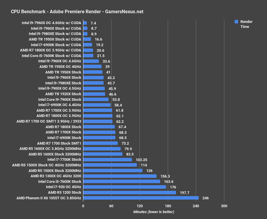 We’ve finally started hitting performance levels in CPUs where our Premiere AVCHD 1080p60 project picking up performance with CUDA, but that’s not the focus of our tests and never has been. We’ve typically only included CUDA results to demonstrate that CPU performance becomes insignificant as production is accelerated with GPUs, but we’re seeing the 1950X, 7960X, and 7980XE breaking the previous 20-minute barrier with CUDA.
