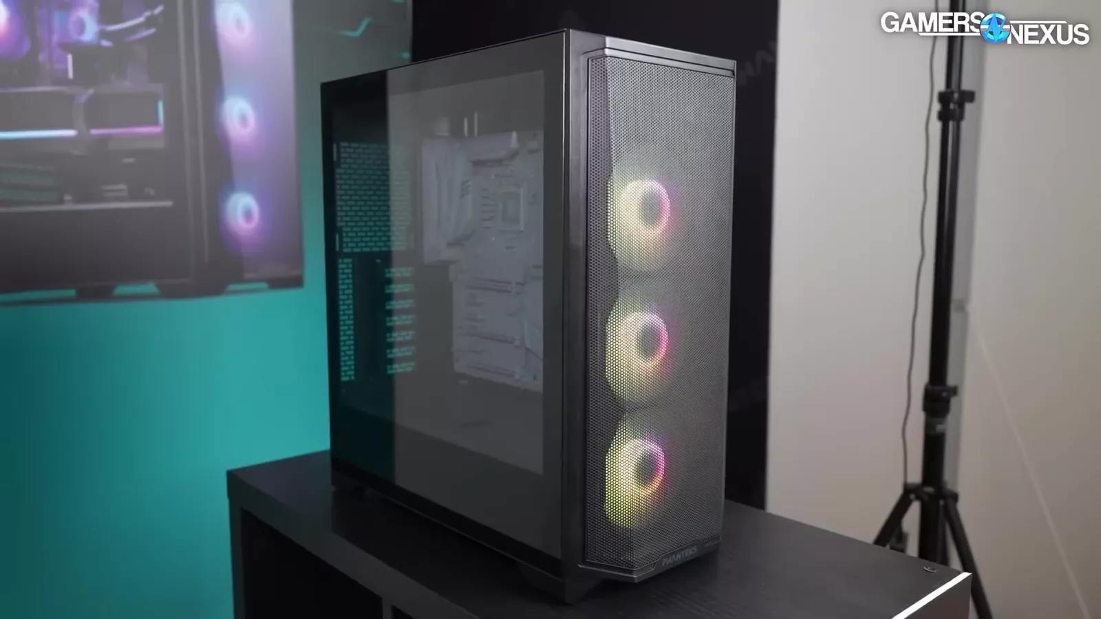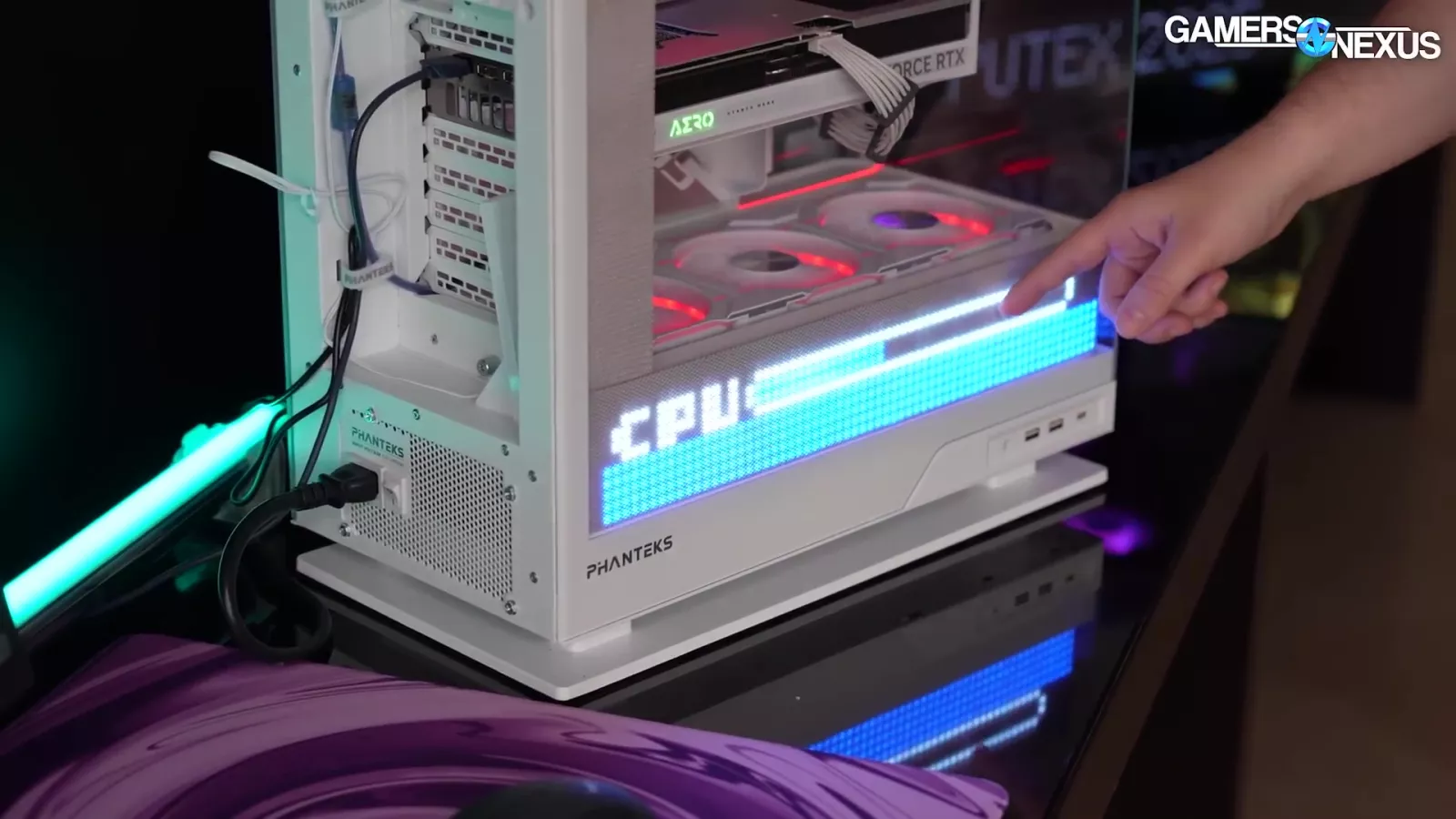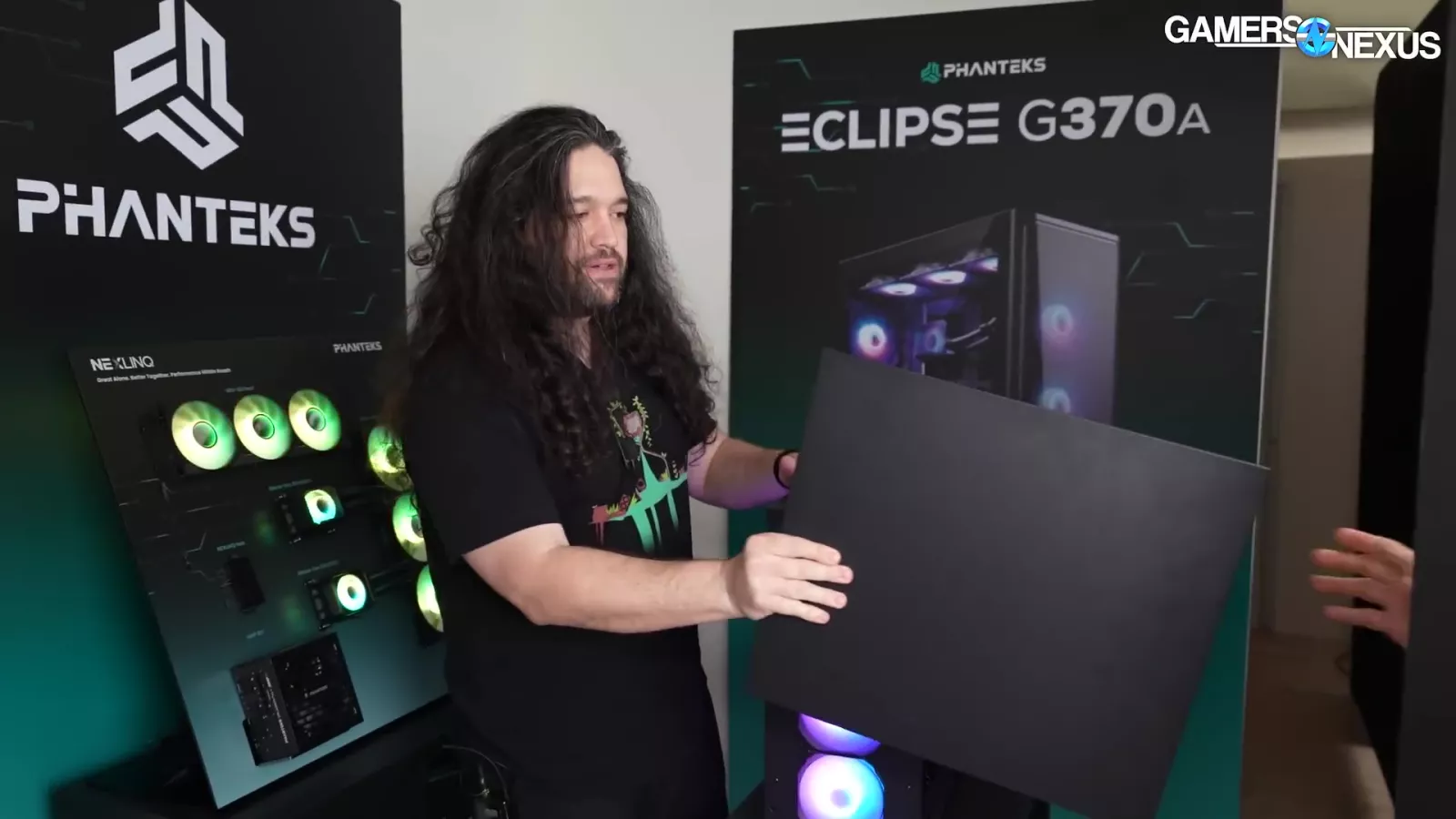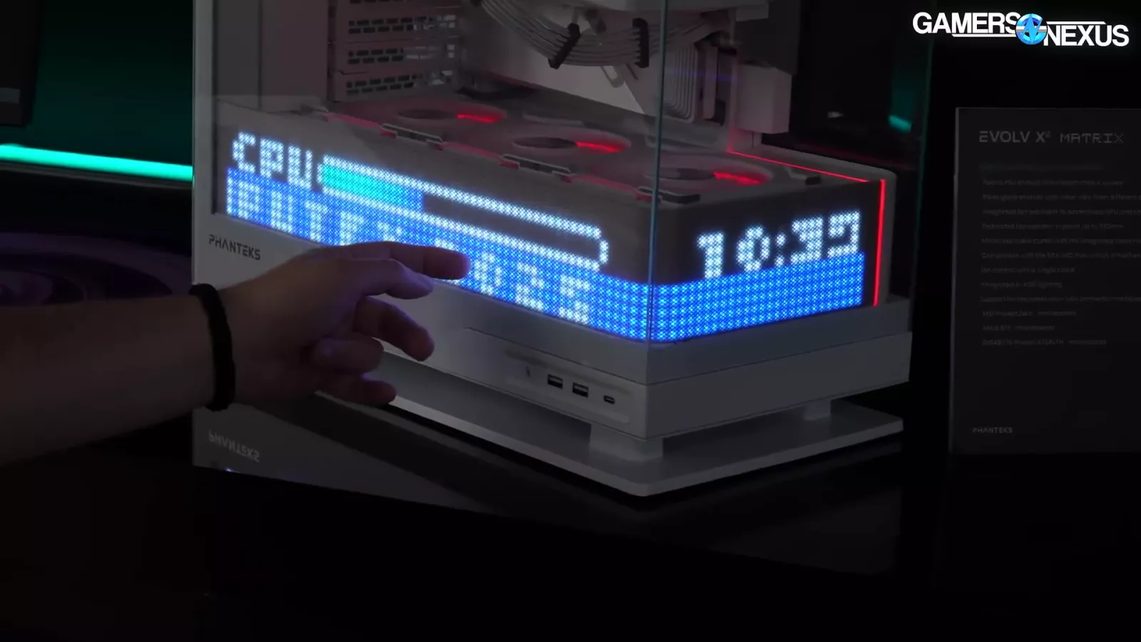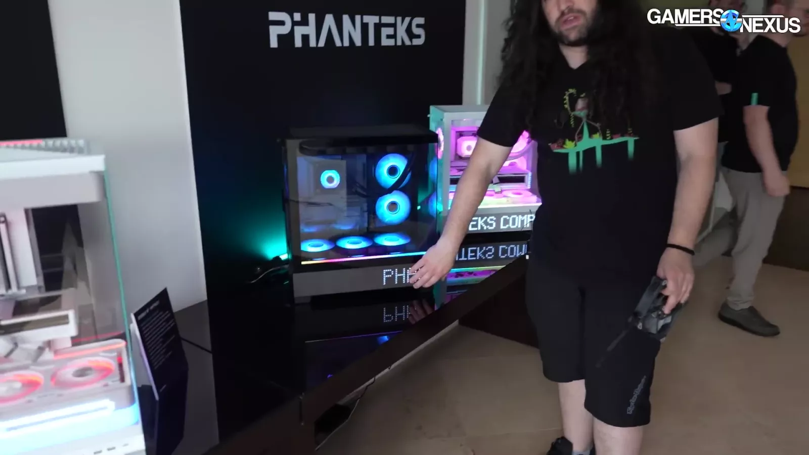 Phanteks also has software that allows you to reconfigure what the LEDs display. When we got to the company’s suite, it had been programmed to say, “Gamers Nexus here,” which was cool to see.