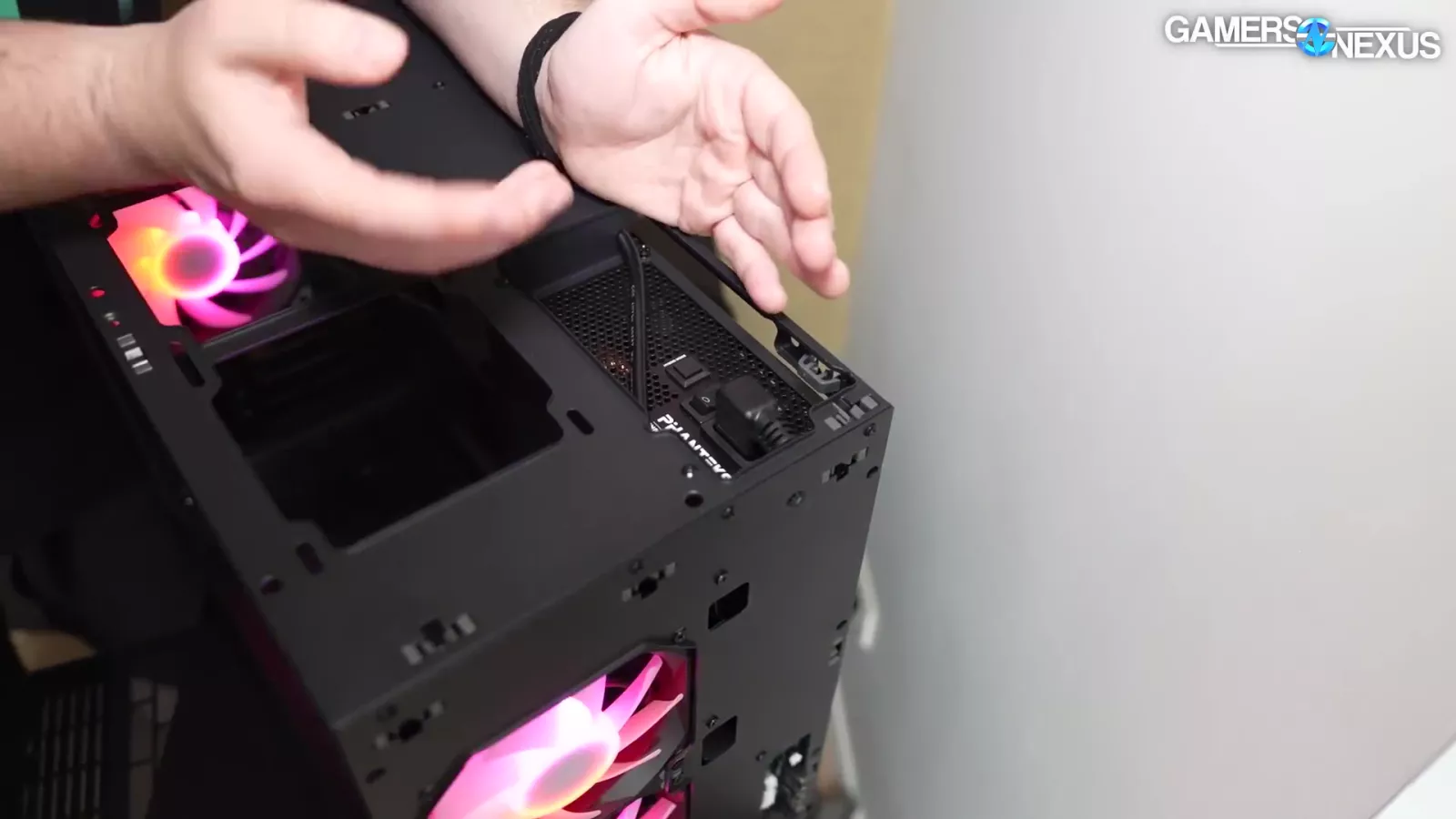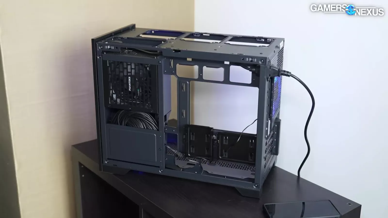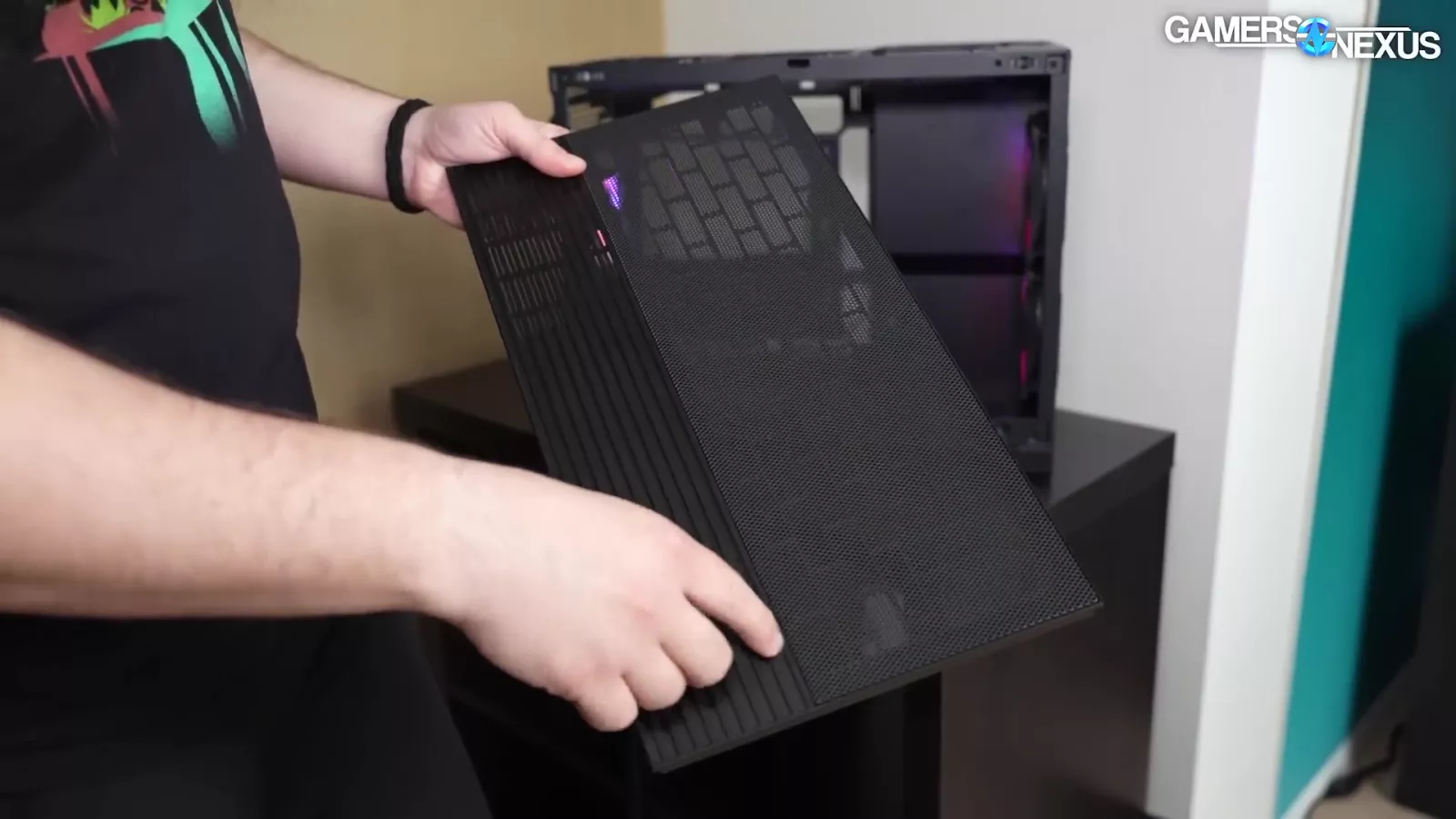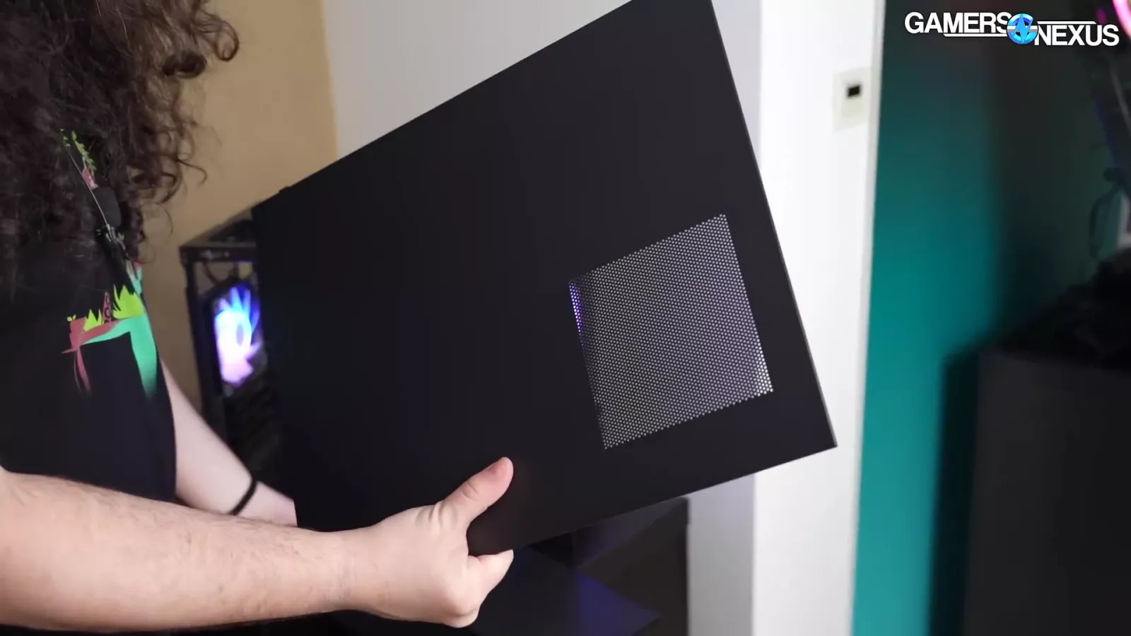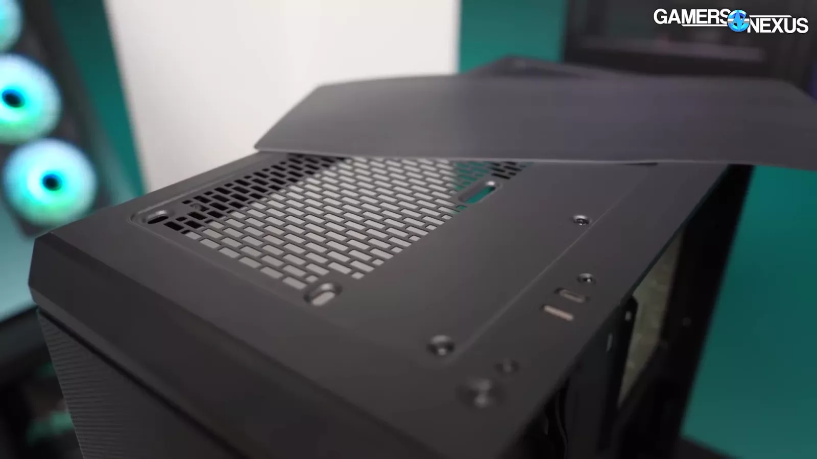 The top panel is part standard ventilation but it does have one side that provides less airflow, which covers where the PSU would exhaust out of. The side panel does have punch-outs for the PSU, however. We don’t test power supplies, though that may change in the future. Power supplies can take a lot of thermal abuse, however, so we’re not super concerned here.