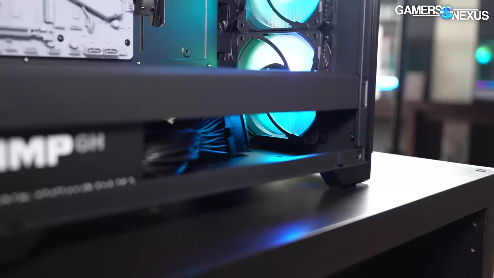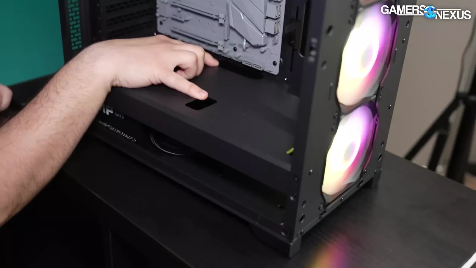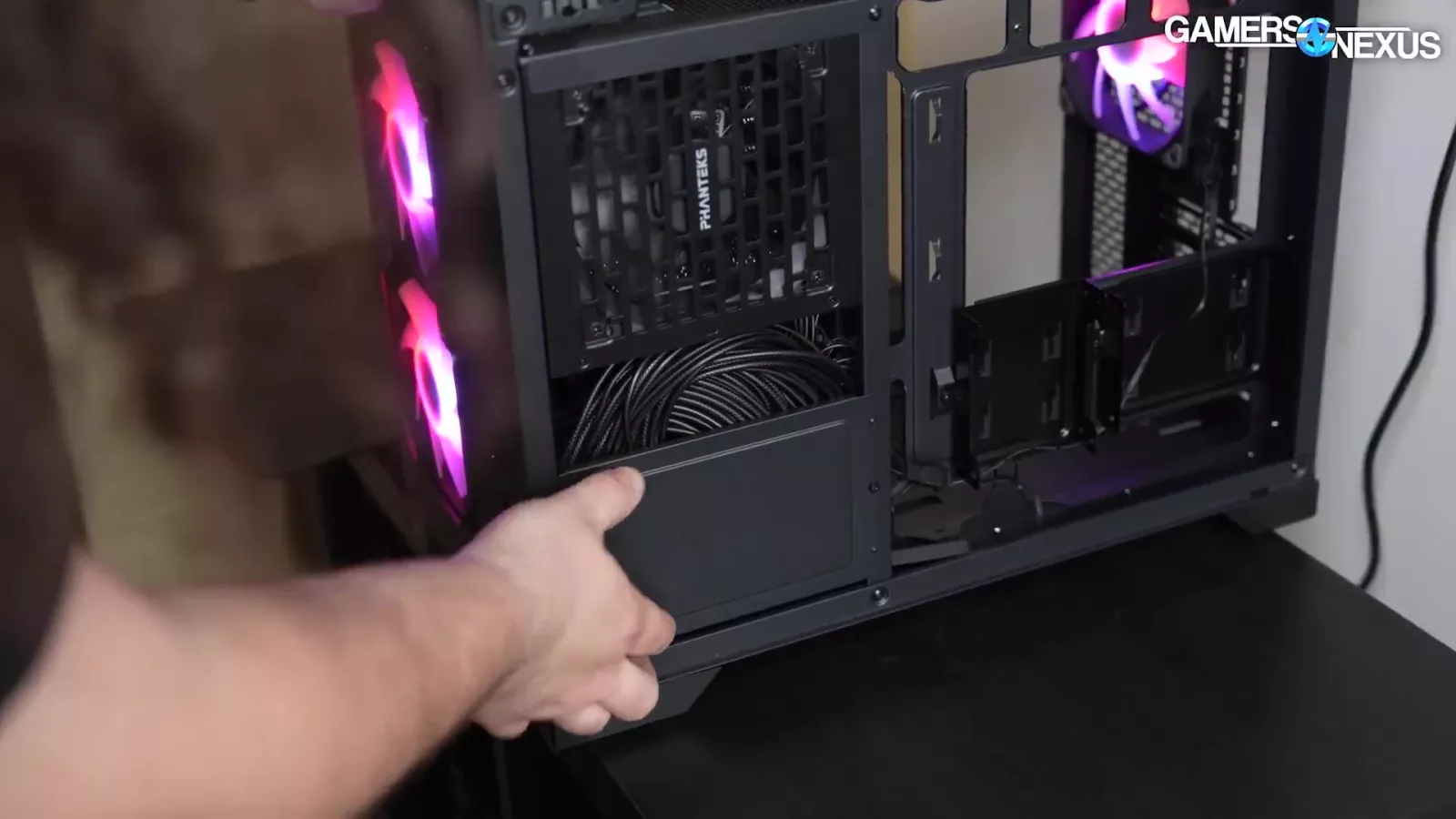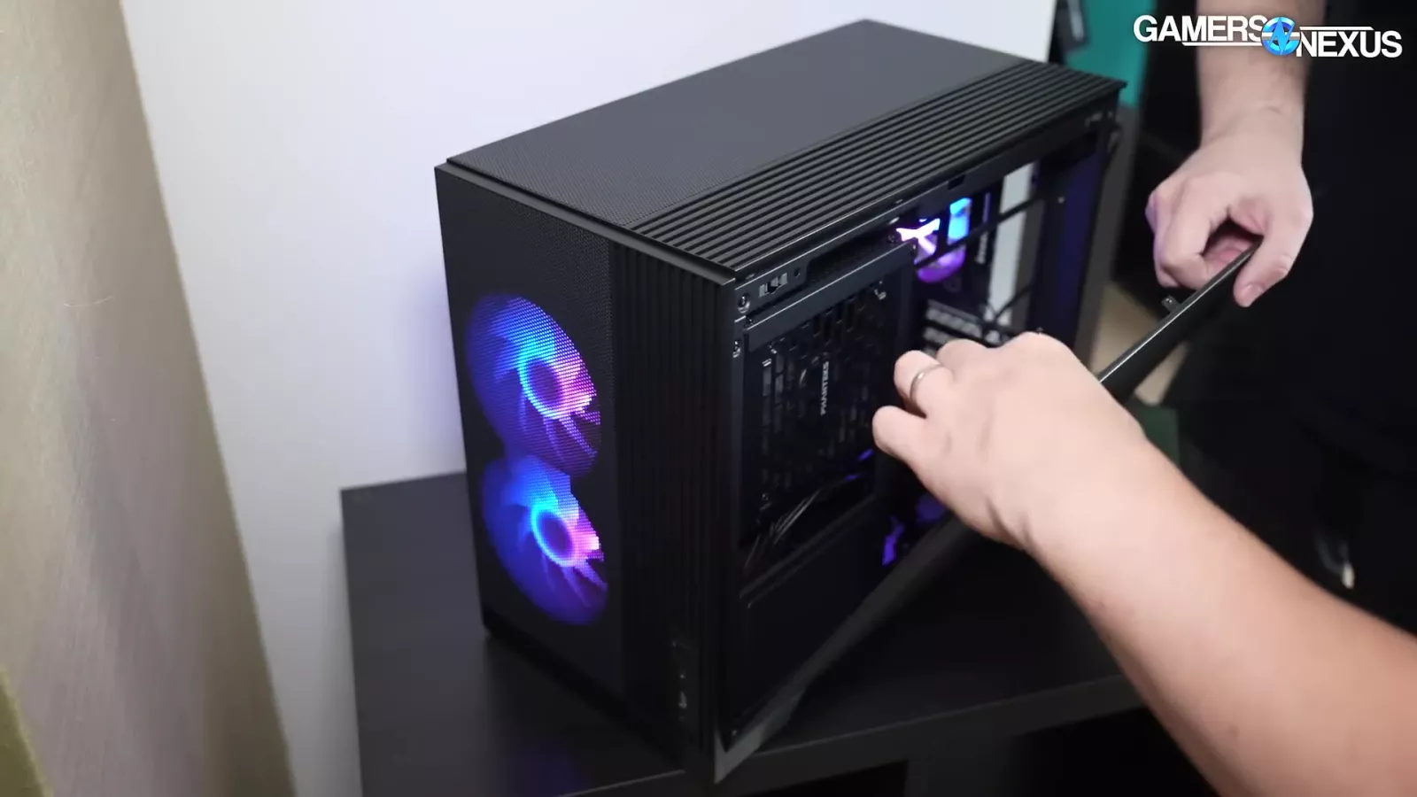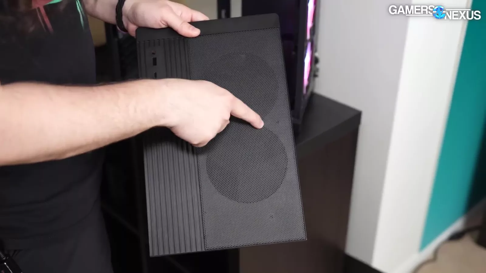 The top panel is part standard ventilation but it does have one side that provides less airflow, which covers where the PSU would exhaust out of. The side panel does have punch-outs for the PSU, however. We don’t test power supplies, though that may change in the future. Power supplies can take a lot of thermal abuse, however, so we’re not super concerned here.