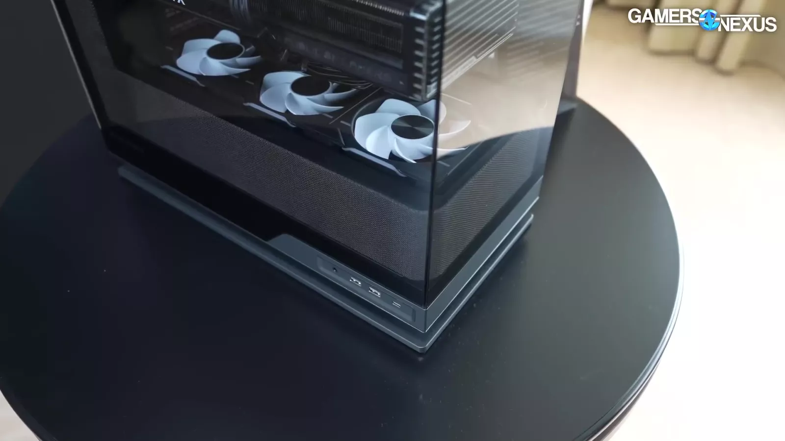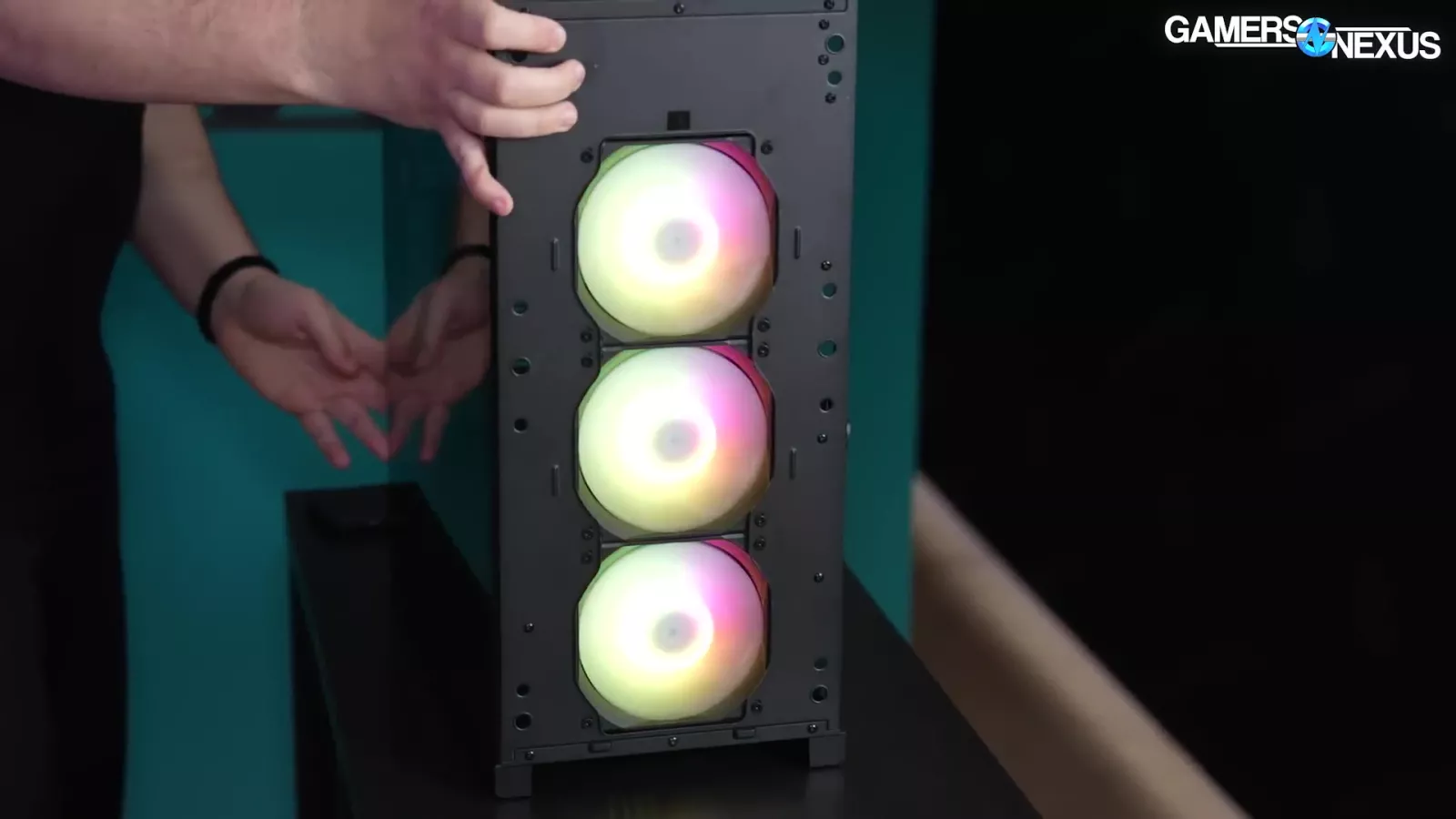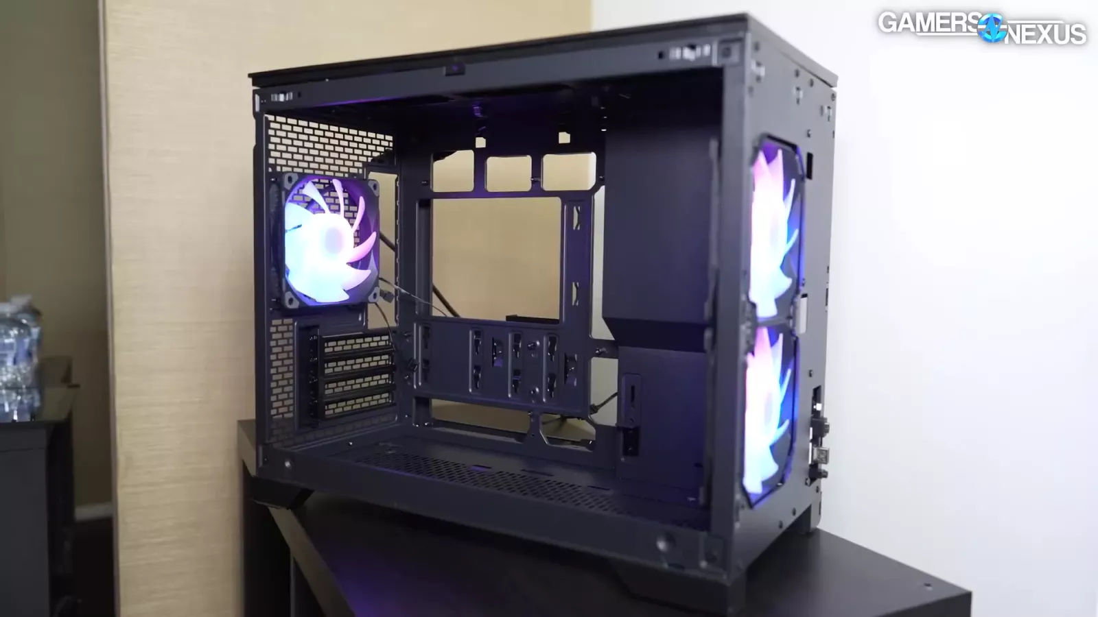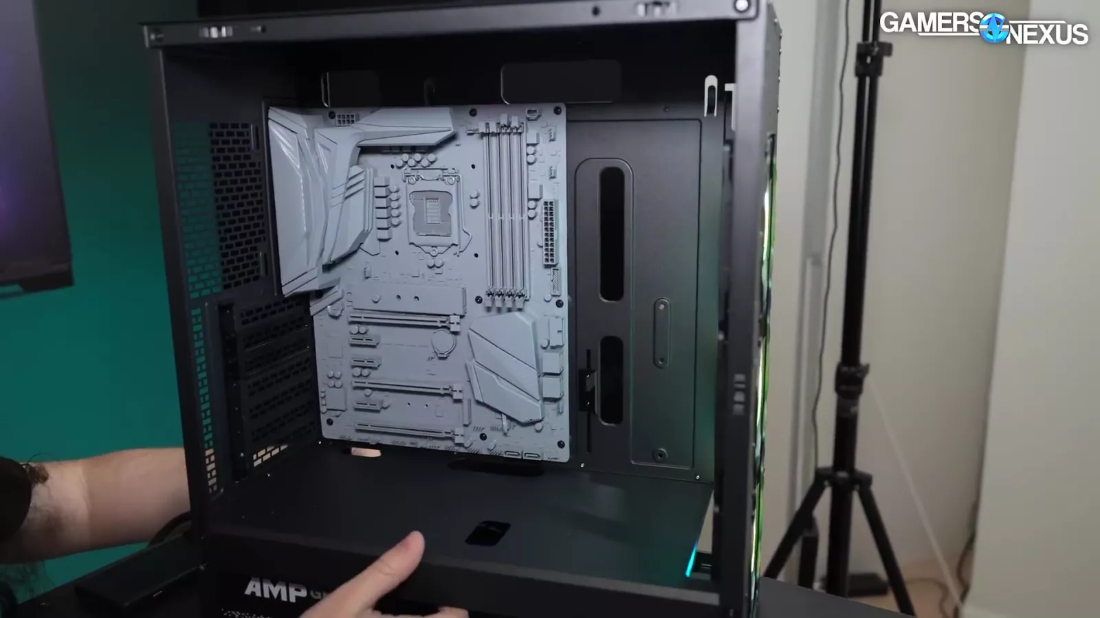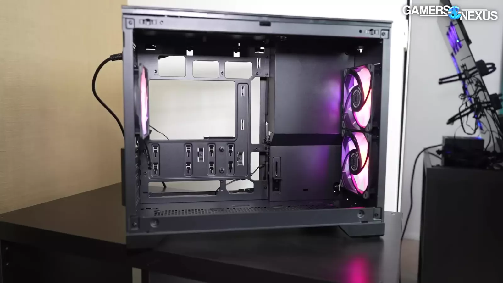 The top panel is part standard ventilation but it does have one side that provides less airflow, which covers where the PSU would exhaust out of. The side panel does have punch-outs for the PSU, however. We don’t test power supplies, though that may change in the future. Power supplies can take a lot of thermal abuse, however, so we’re not super concerned here.