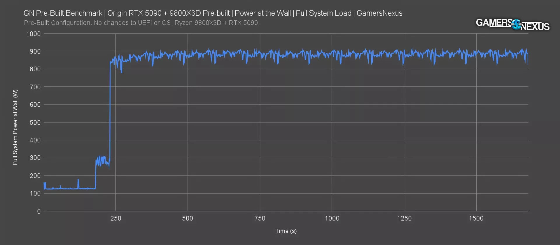 We see a slight ramp upwards in power consumption after that, which tracks with increasing leakage as the parts heat up, before settling in at an average of 884W at steady state.