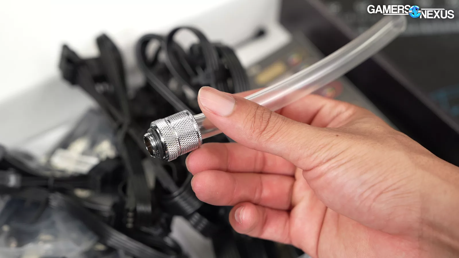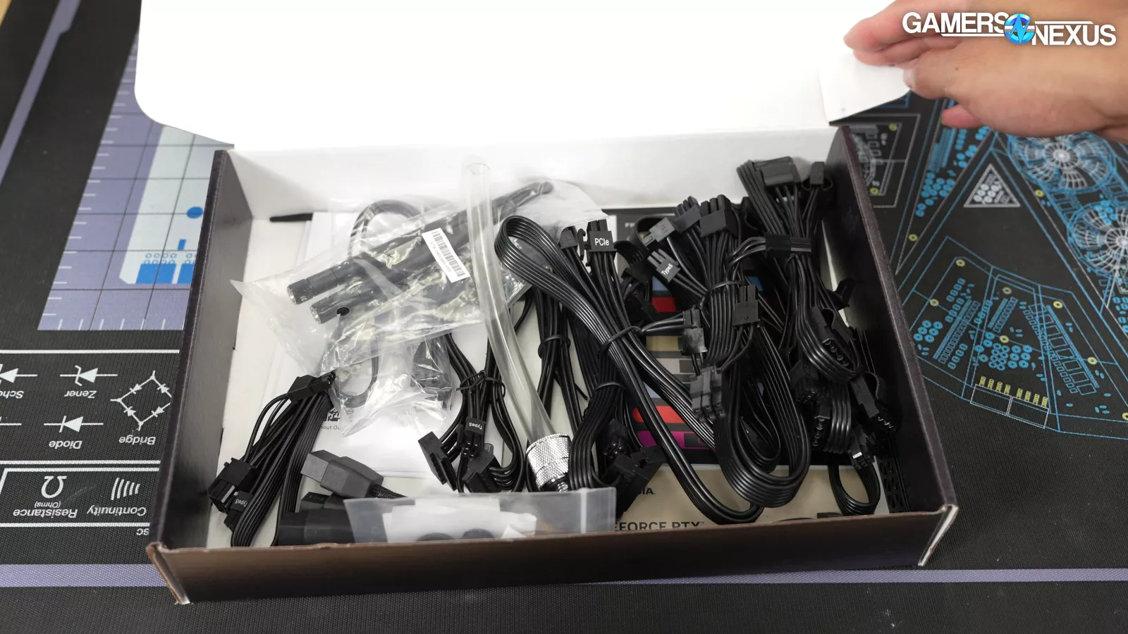 The accessory kit is basic, and came inside of a box with the overused cringey adage “EAT SLEEP GAME REPEAT” printed on it. Inside are the spare PSU cables (that we’re happy to see included), an AC power cable, stock 5090 FE power adapter, standard motherboard and case accessories, a G1/4 plug tool and extra plugs, and a piece of soft tubing with a fitting on one end that can be used to help drain the cooling loop. All of this is good.