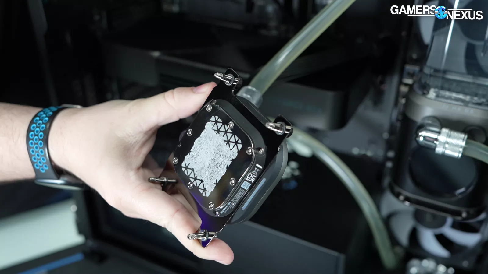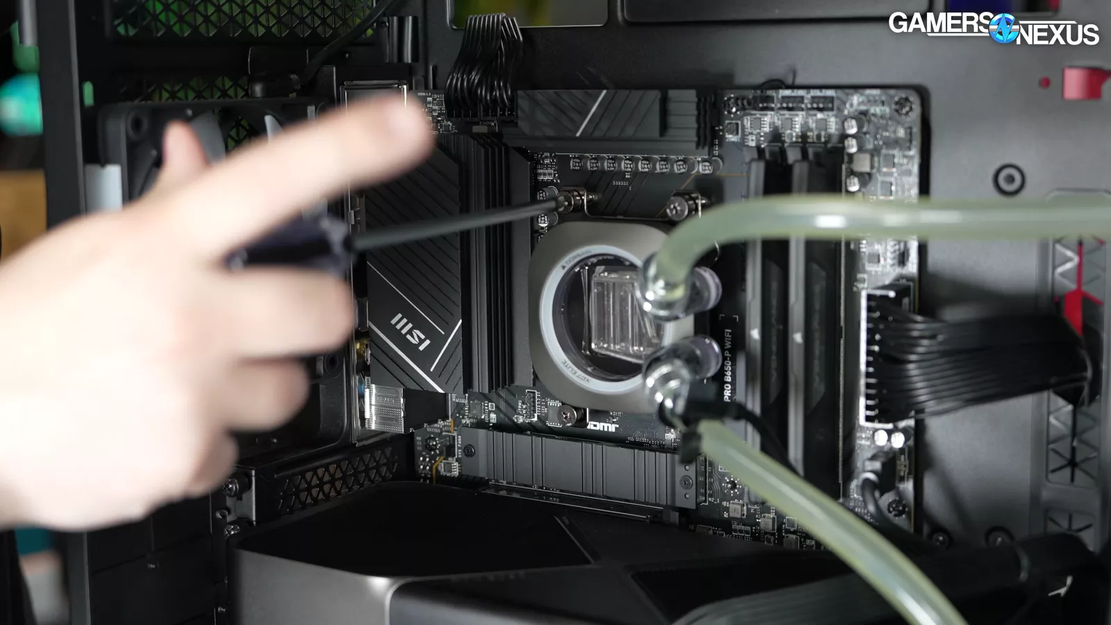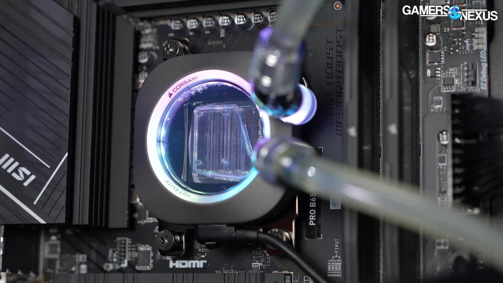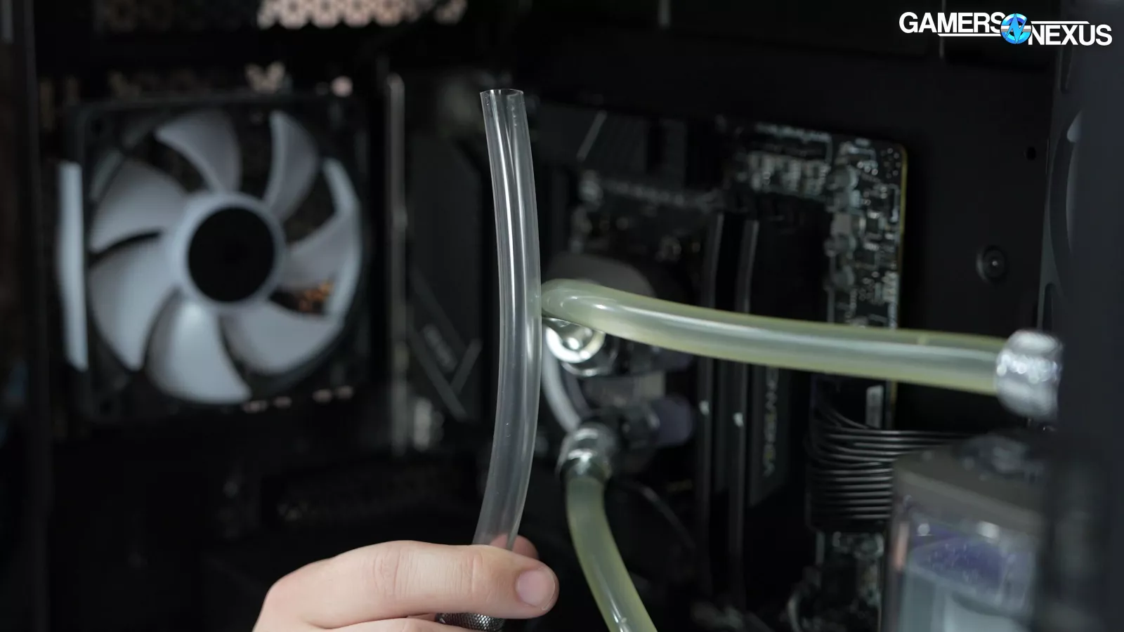 Here’s a closer look at Origin’s “premium” cooling solution, complete with saggy routing that looks deflated and discolored tubing that has that well-hydrated catheter tube coloring to it.