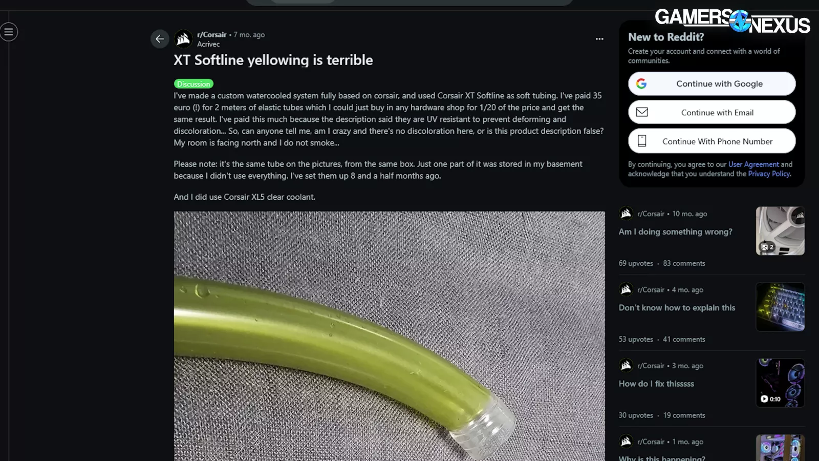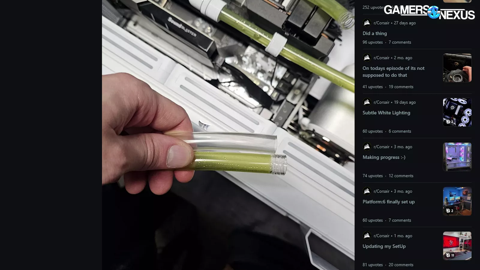 So clearly something is wrong. Or not “clearly,” actually, seeing as it’s not clear. The tubing looks gross. It shouldn’t look gross. The spare piece in the accessory kit doesn’t look gross. The coolant is even Corsair’s own XL8 clear fluid, making it even more inexcusable.