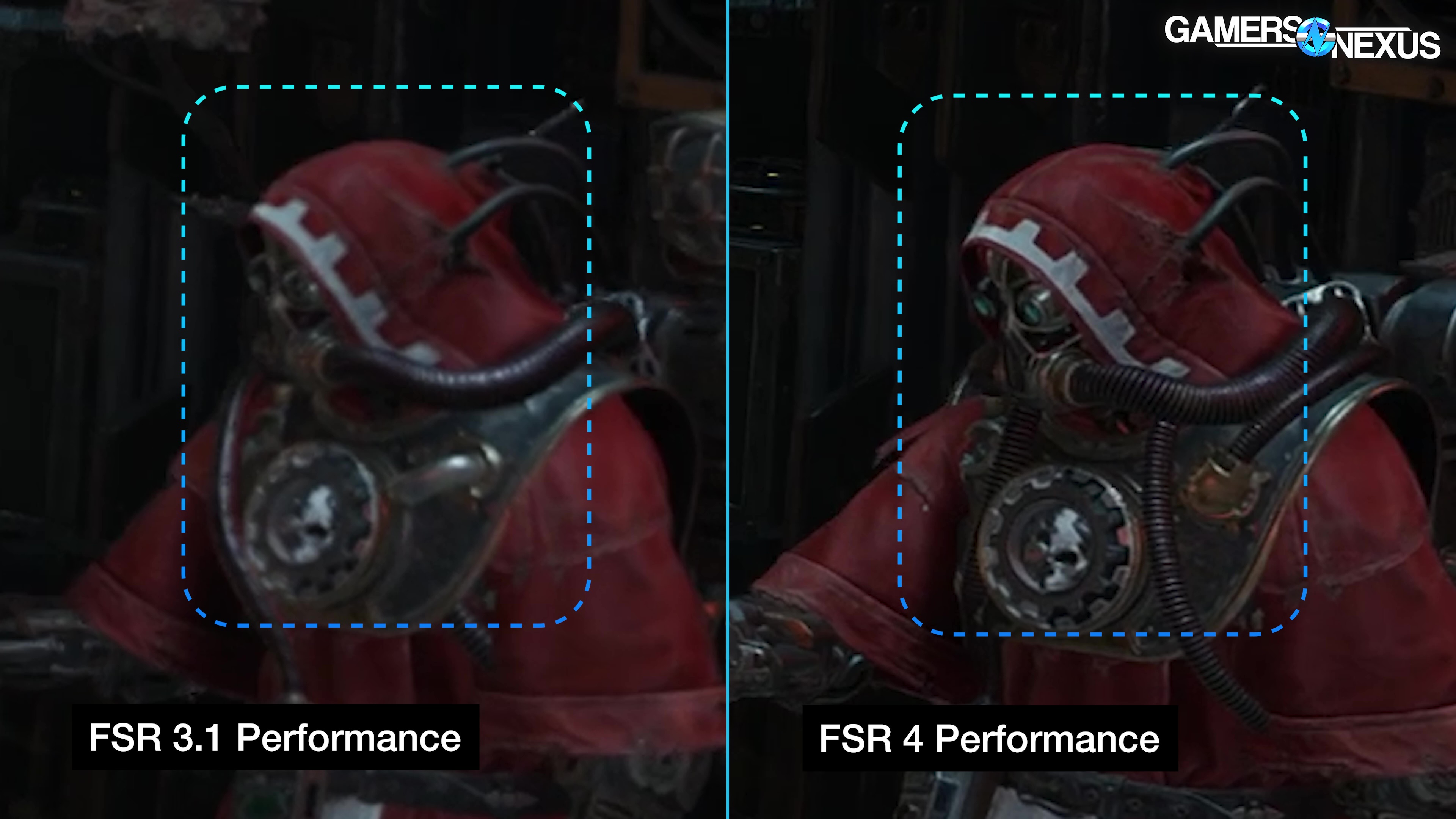 Examples of this include the floor, where we see improved image stability and clarity, the Ultramarine’s armor showing similar improvements in a side-by-side, the distant hanging cables, and the tech priests’ hoods. Distant candle flames that can’t even be made out with FSR 3.1 are visible with FSR 4, bringing them back into existence.